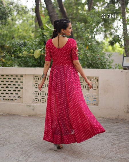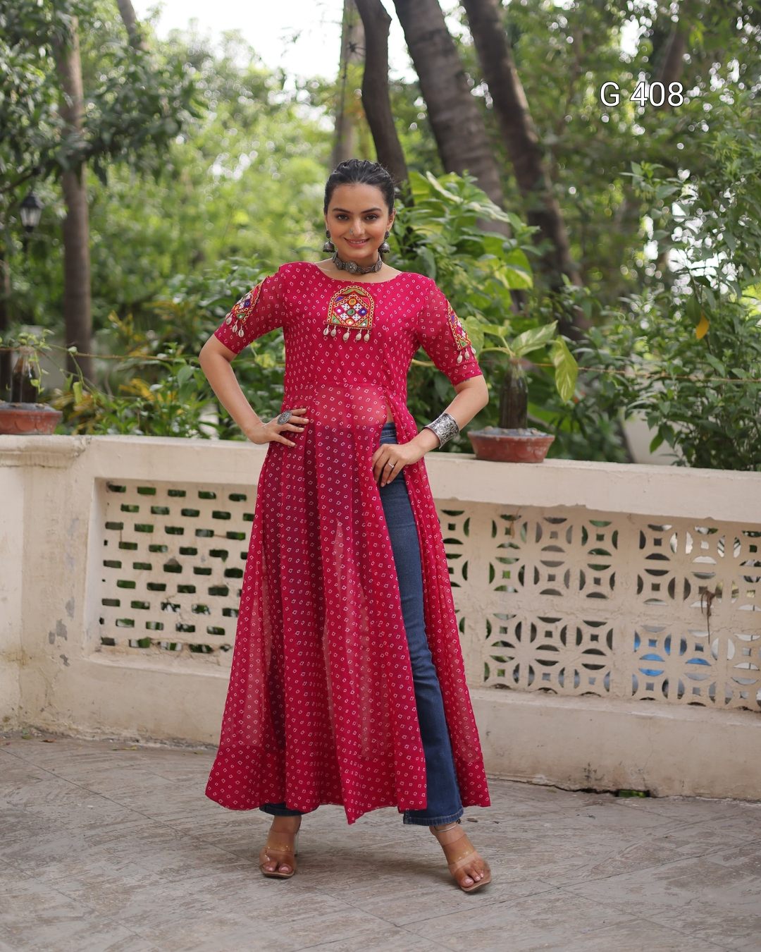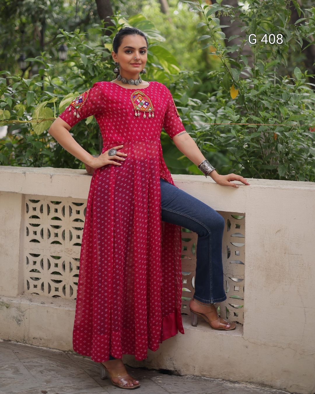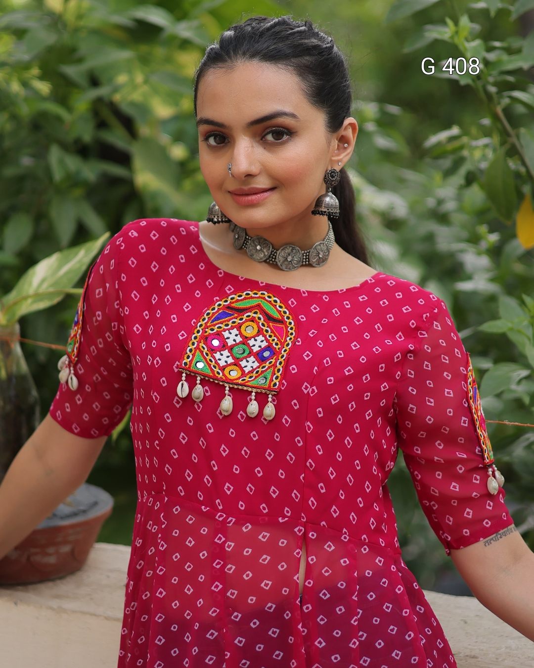 Bandhani Print Faux Georgette Kurti with Kutchi Patchwork – G 408 Pink
