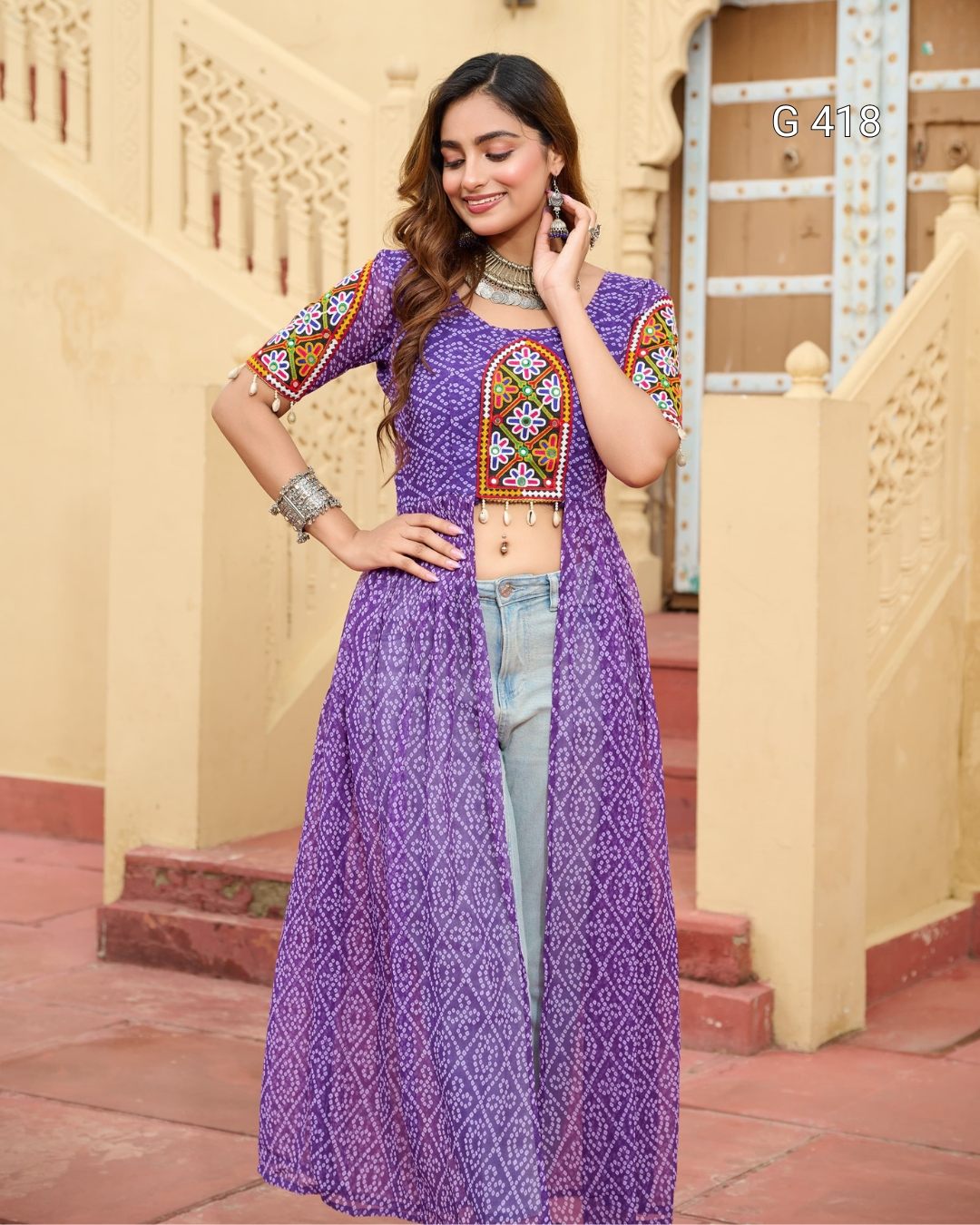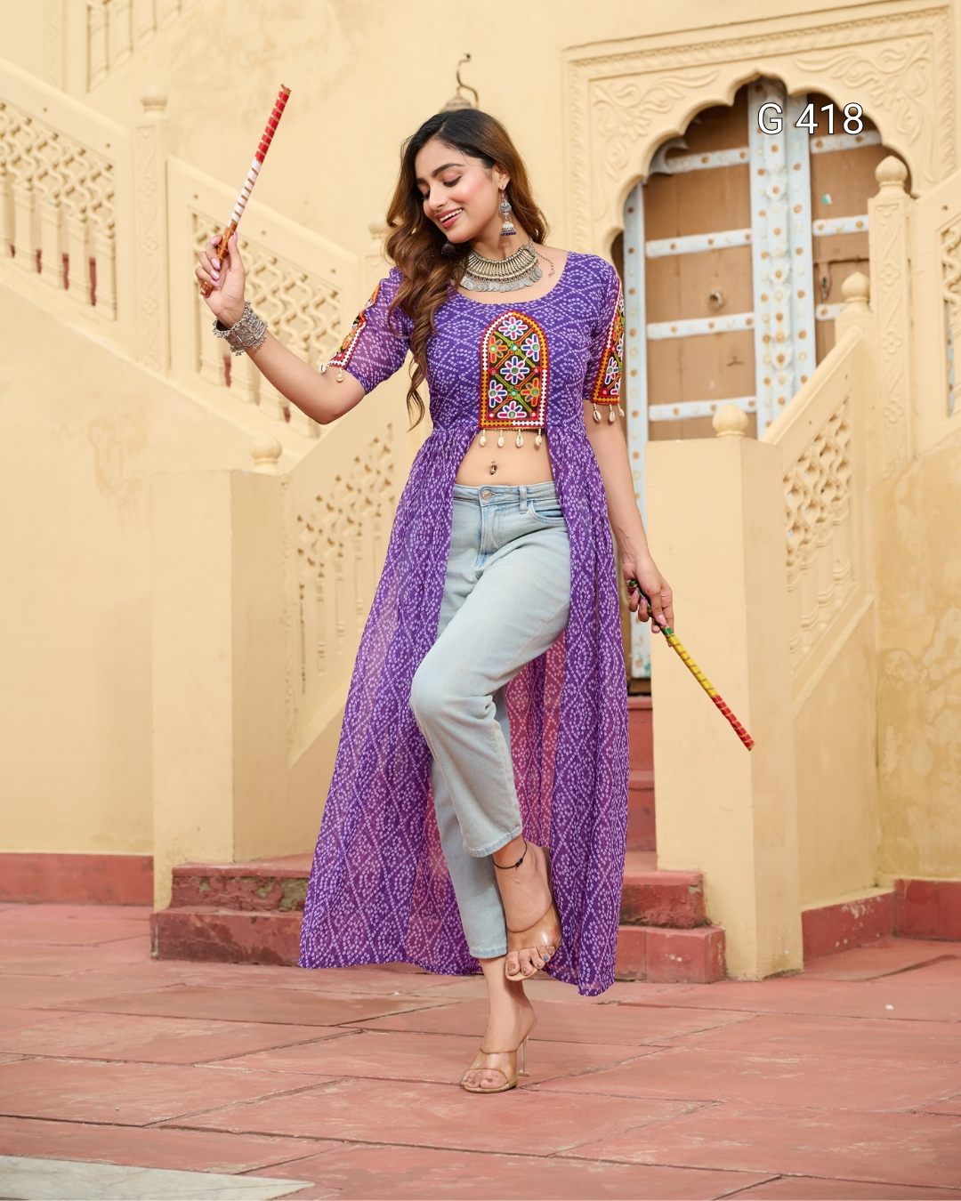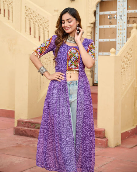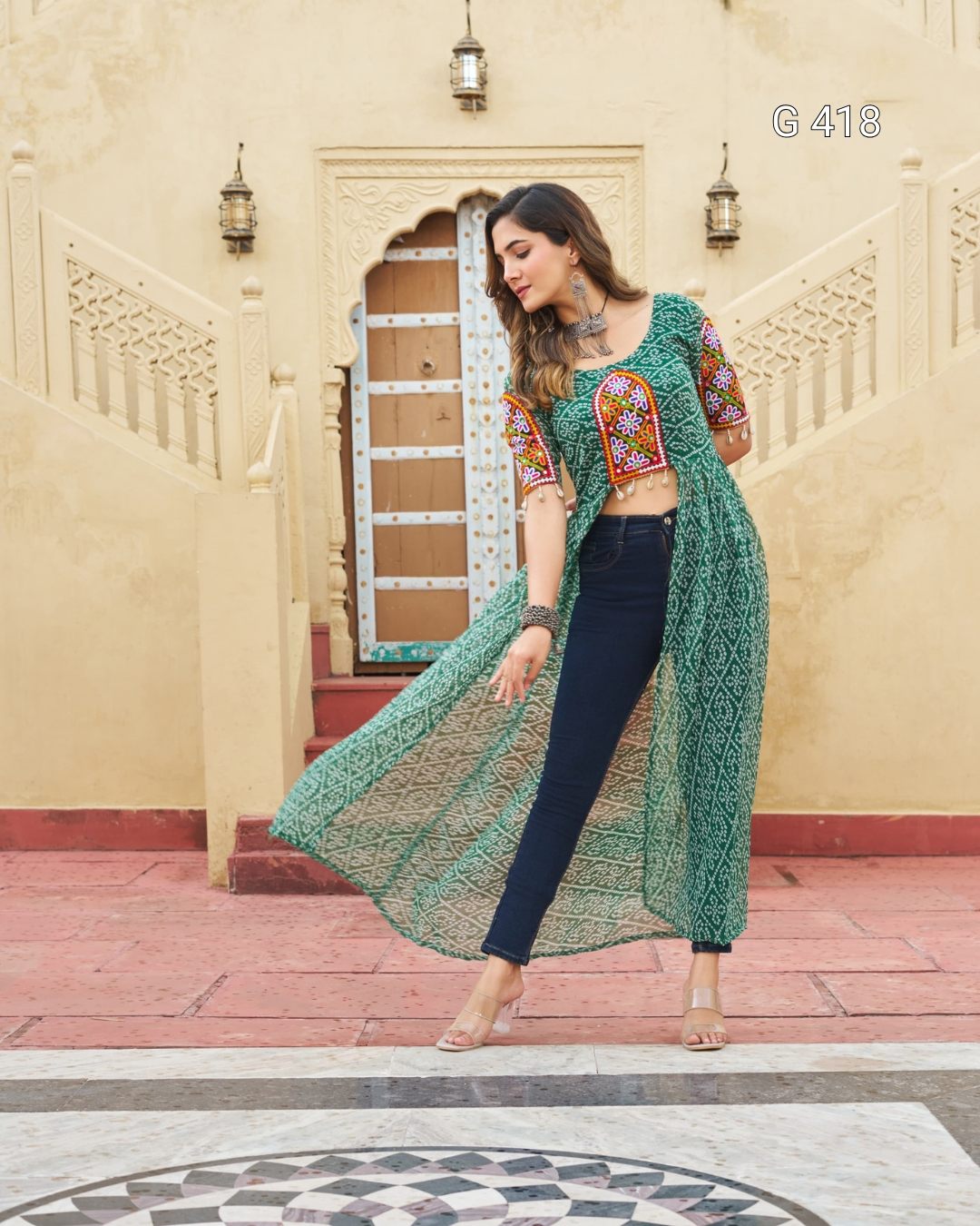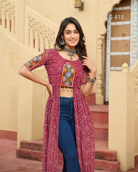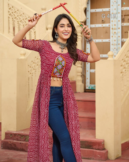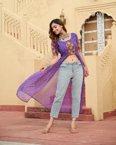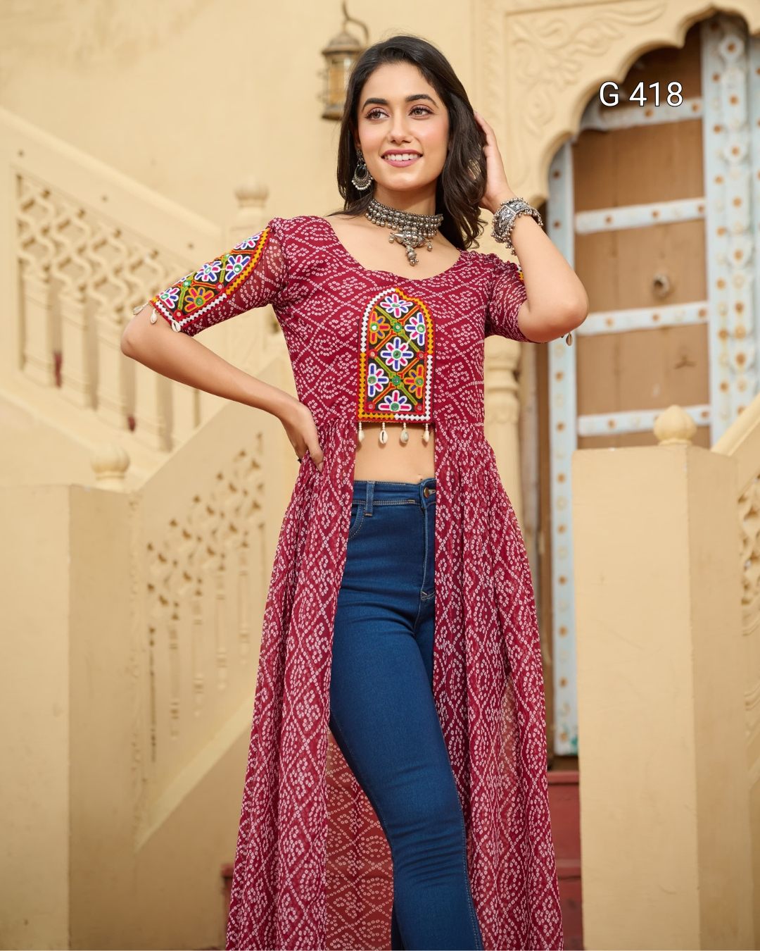 Bandhani Print Faux Georgette Kurti with Kutchi Patchwork – G 418