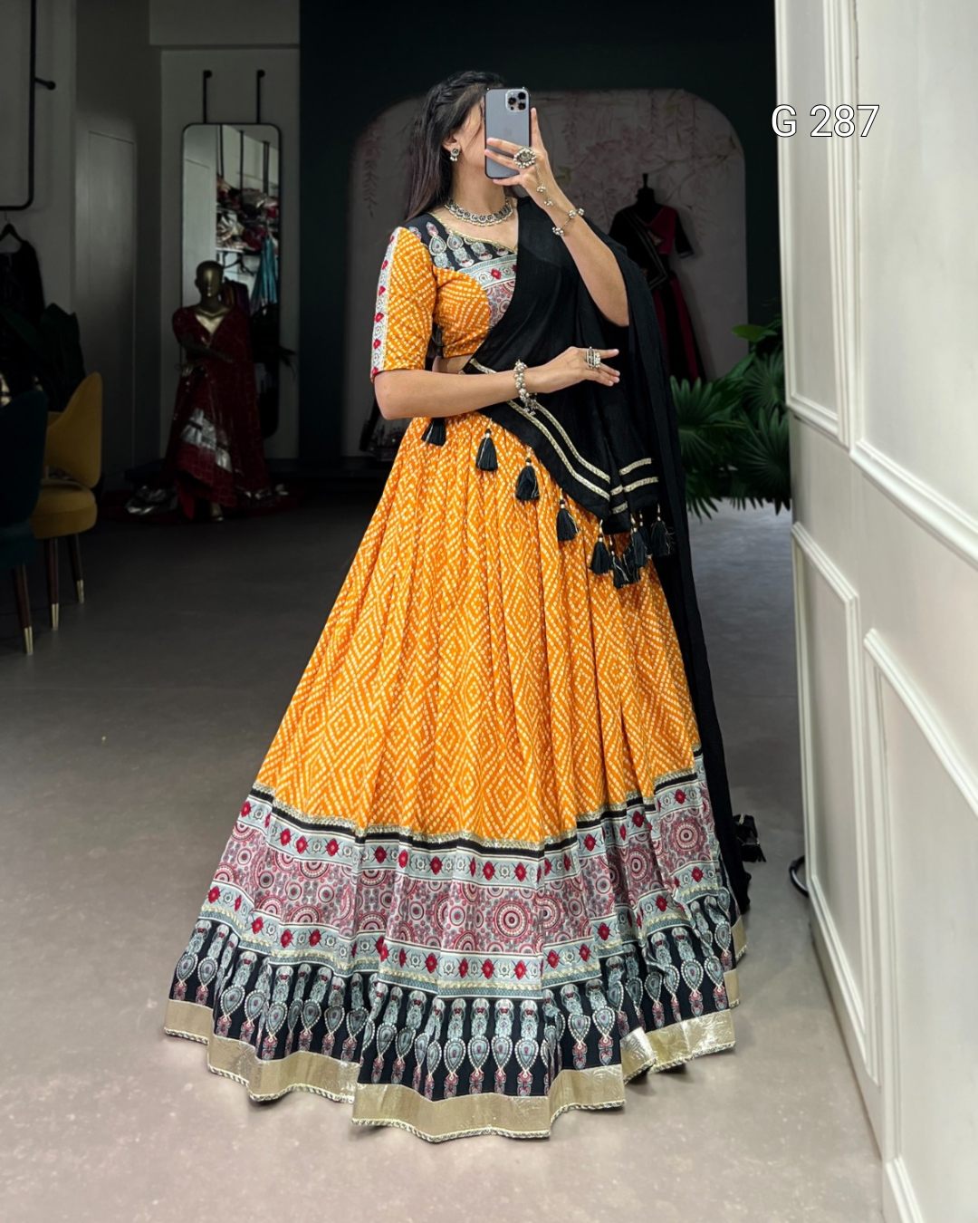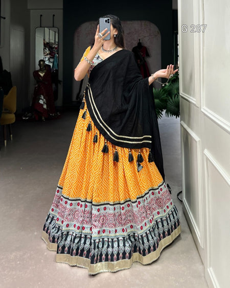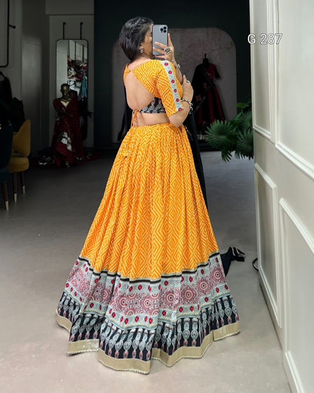 Bandhej & Ajrakh Print Rayon Lehenga with Embossed Design & Gota Lace – G 287 Yellow