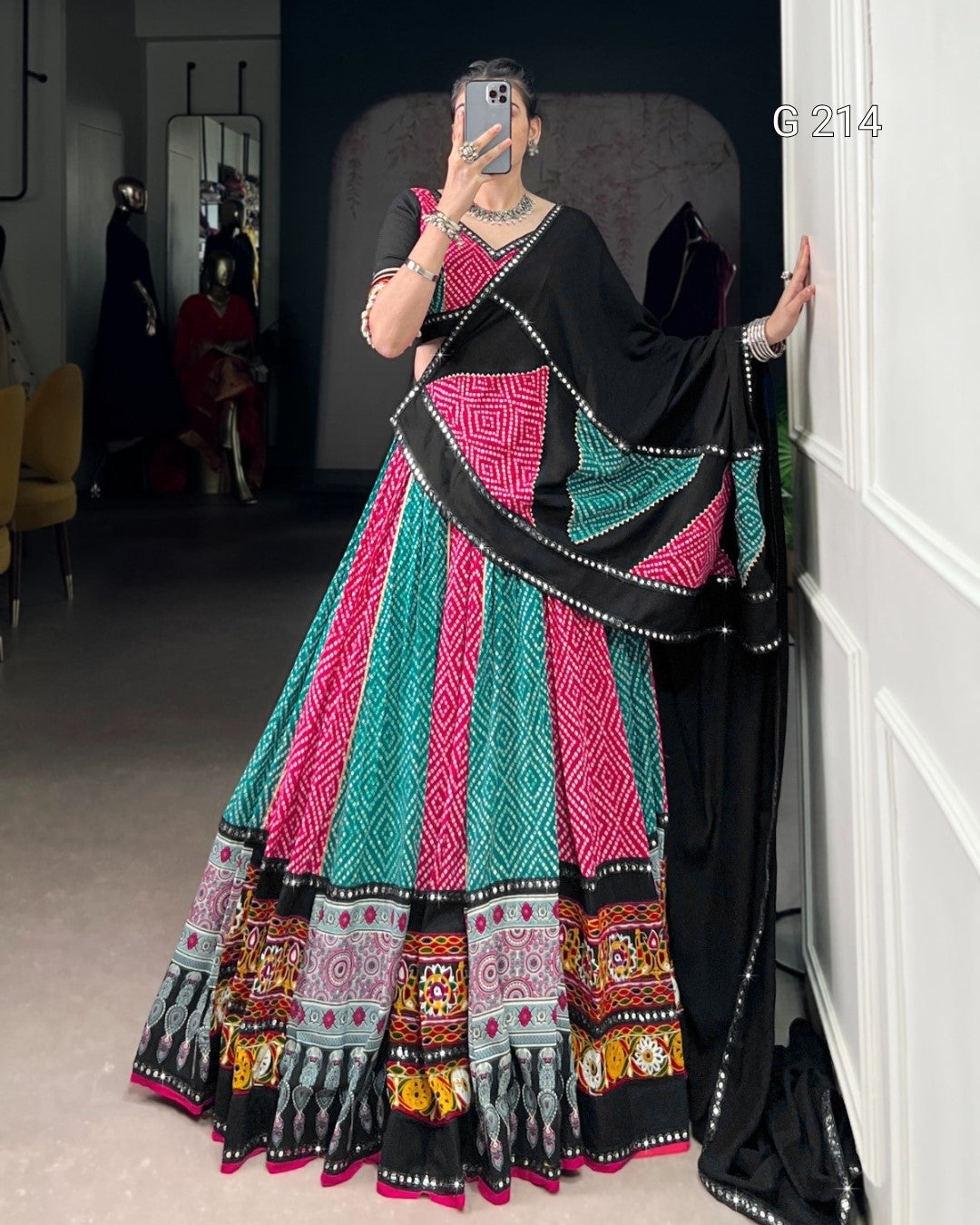 Work: Bandhej And Ajarakh With Paper Mirror And Gamthi Work Lace Touch Up