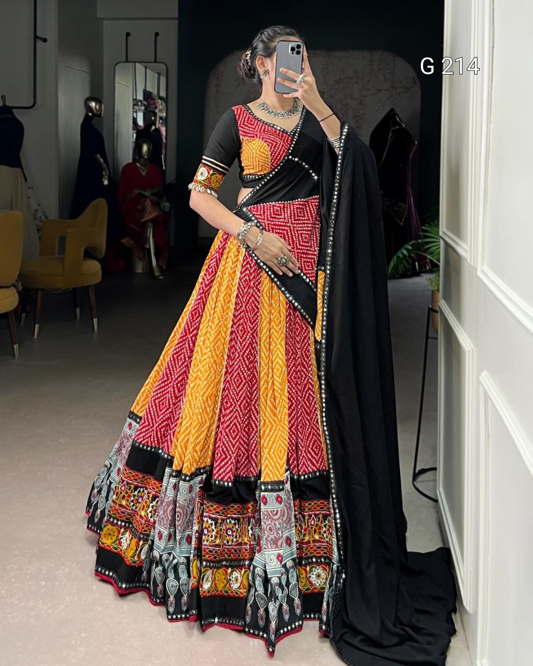 Bandhej and Ajarakh Pure Rayon Lehenga with Paper Mirror & Gamthi Work – G 214 Yellow