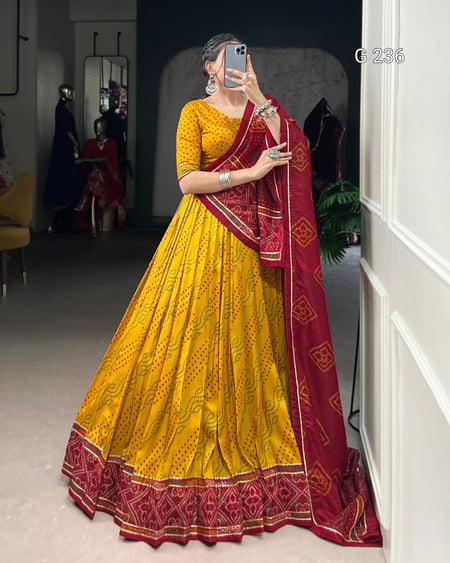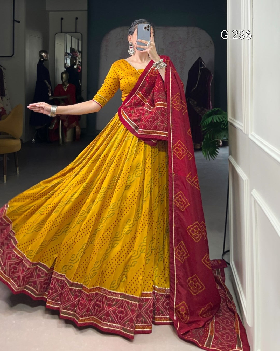 Bandhej Print Tasar Silk Lehenga with Gotta Patti Lace – G 236 Yellow