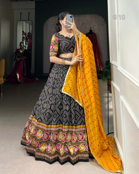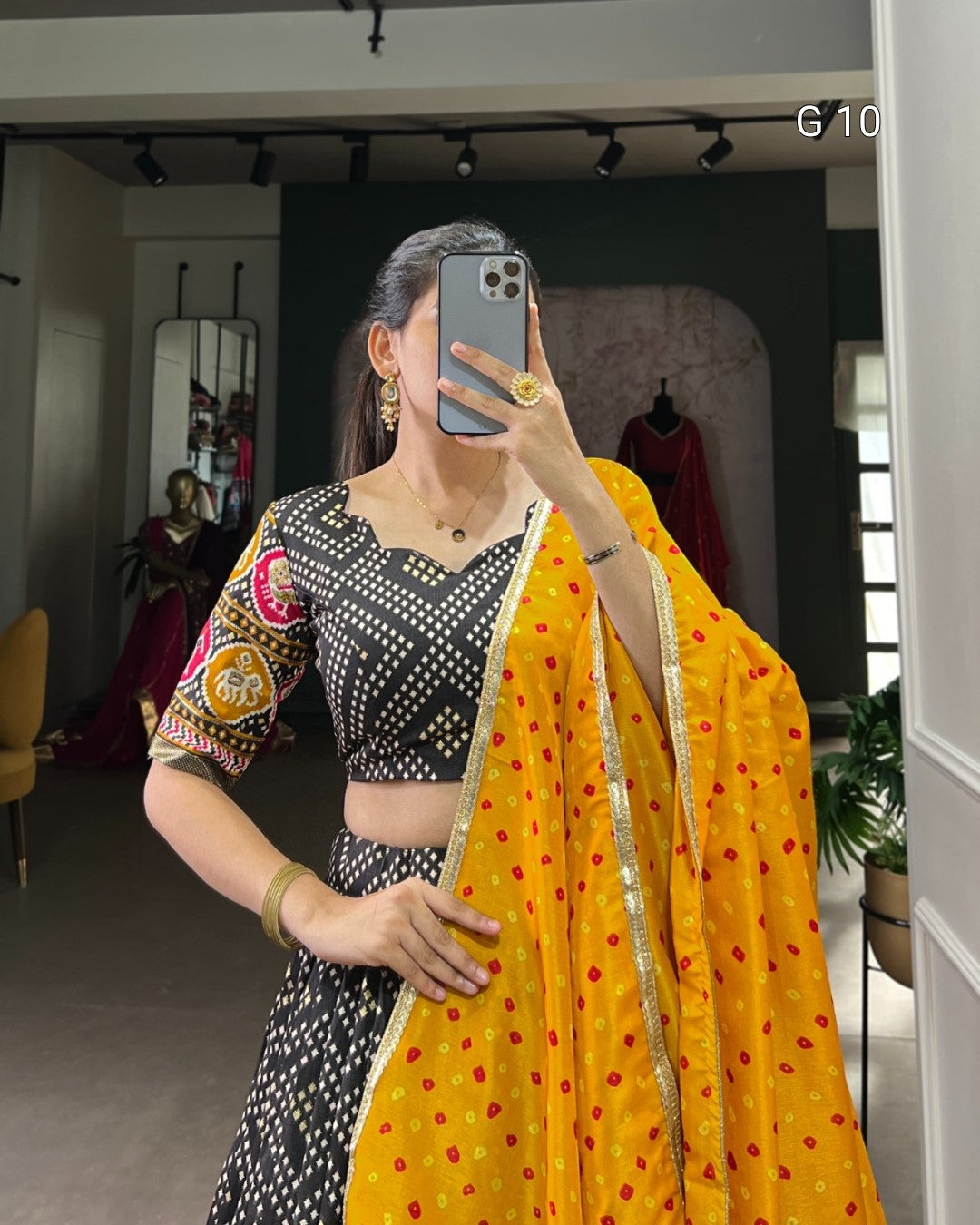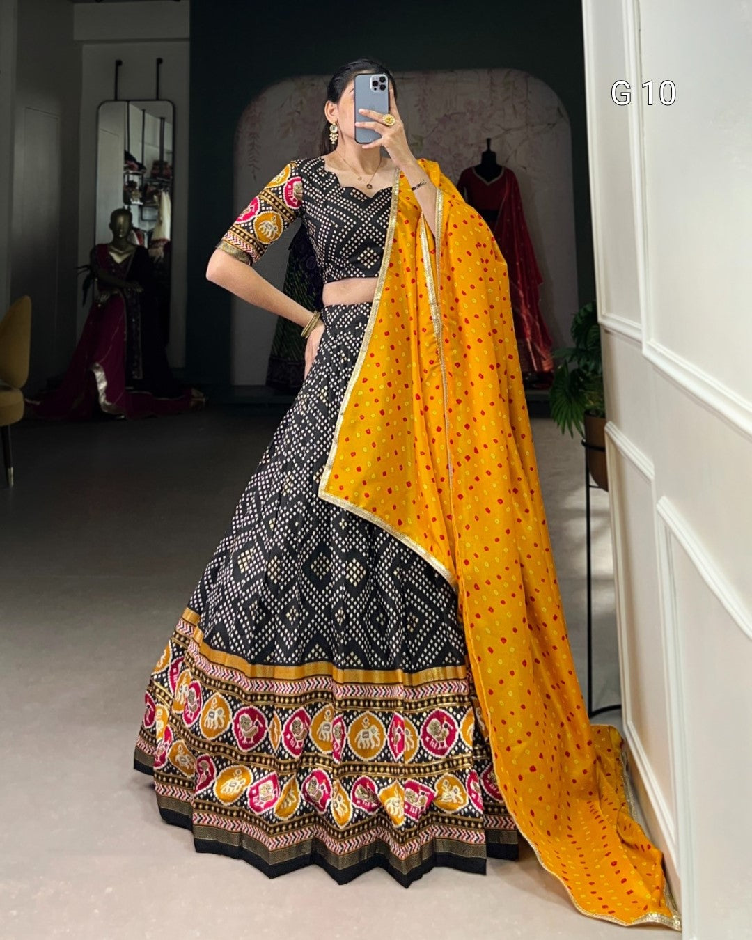 Black Tasar Silk Lehenga with Bandhej and Patola Print – Foil Work, Stitched Blouse, and Dola Silk Dupatta - G 10 Black
