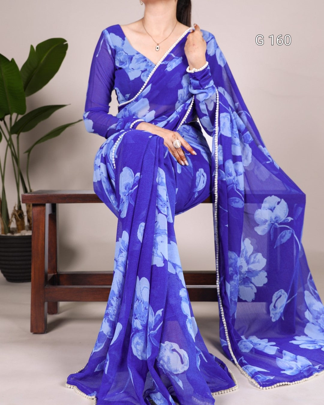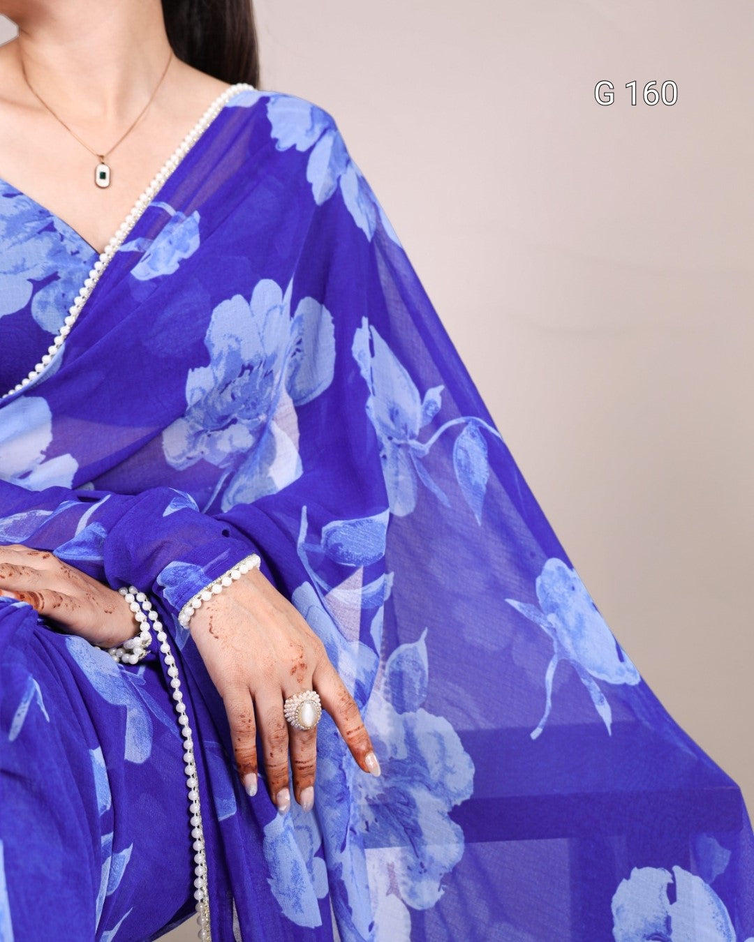 Blue Chiffon Saree with Floral Print & Pearl Lace Border-G 160 Blue