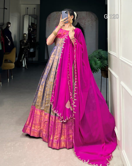 Blue Kanjivaram Gown with Zari Weaving Work and Sequins Dupatta - G 120 Blue