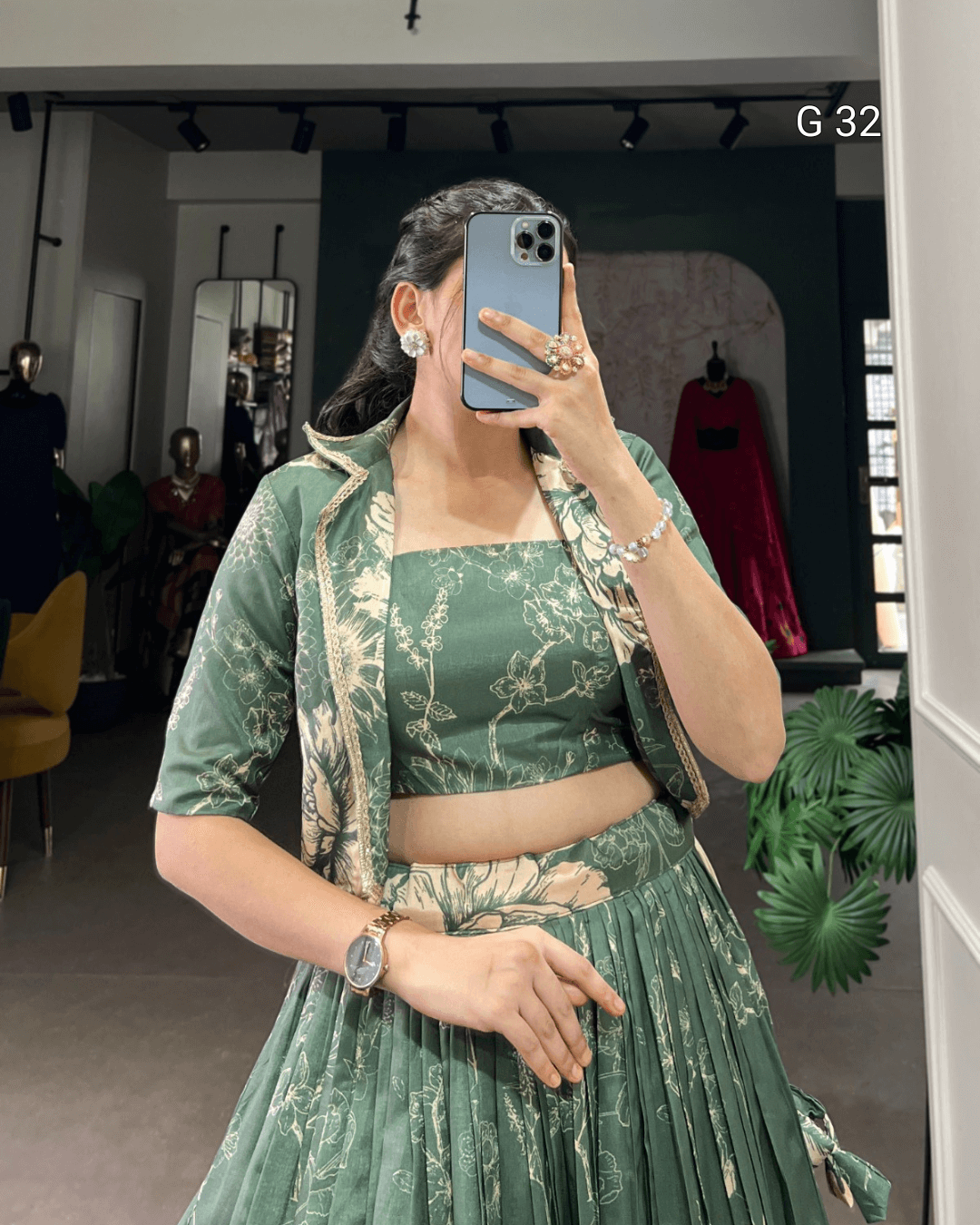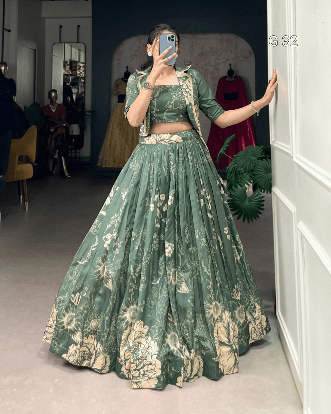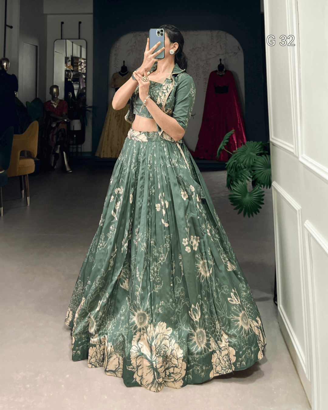 Bottle Green Tussar Silk Lehenga with Floral Print – G 32 Bottle Green