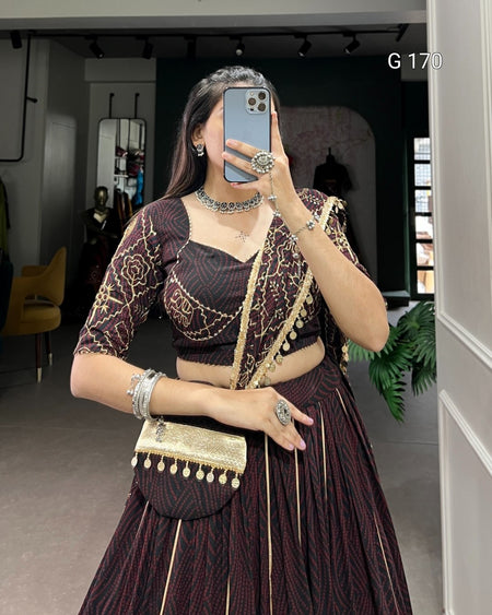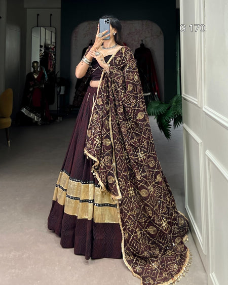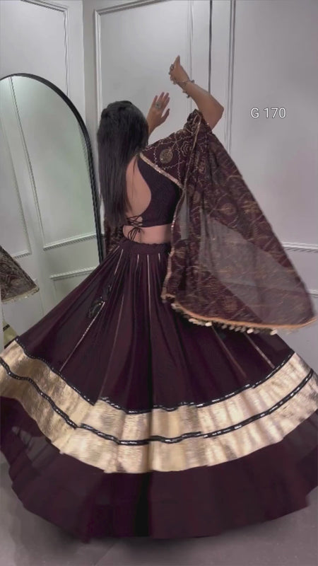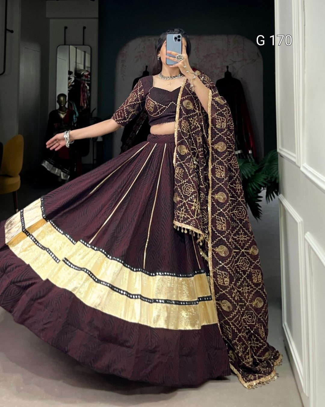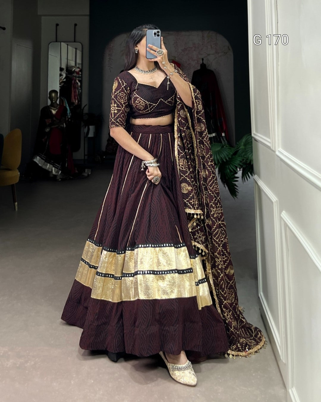 Coffee Georgette Bandhej Print Lehenga with Embossed Design & Gota Patti Touch-Up – G 170 Coffee