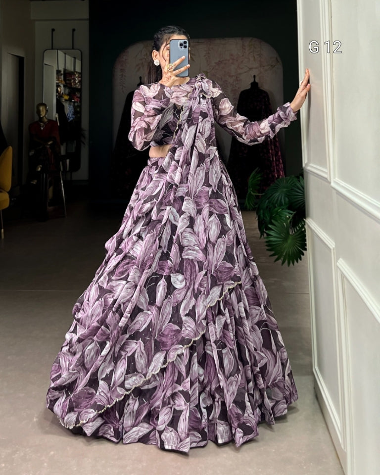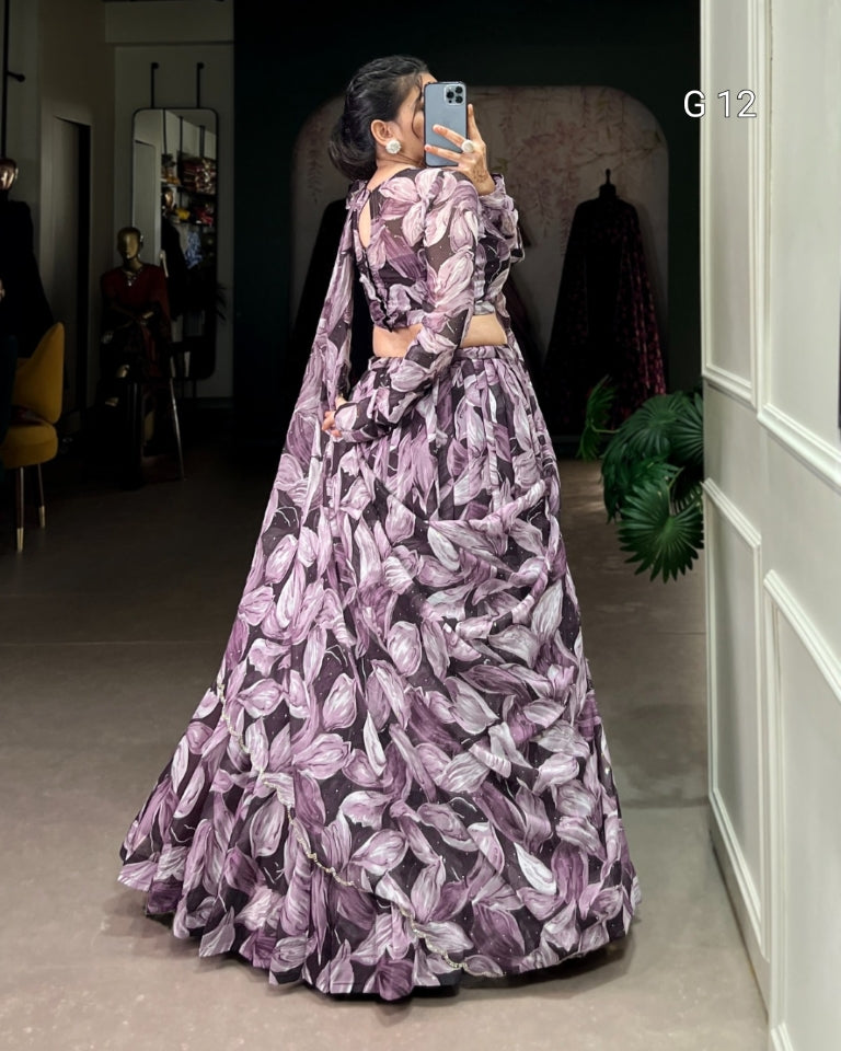 Coffee Tabby Silk Lehenga with Printed Hotfix Work – G 12 Coffee