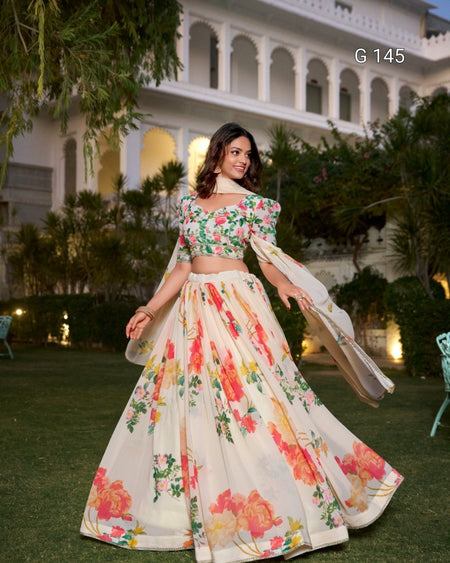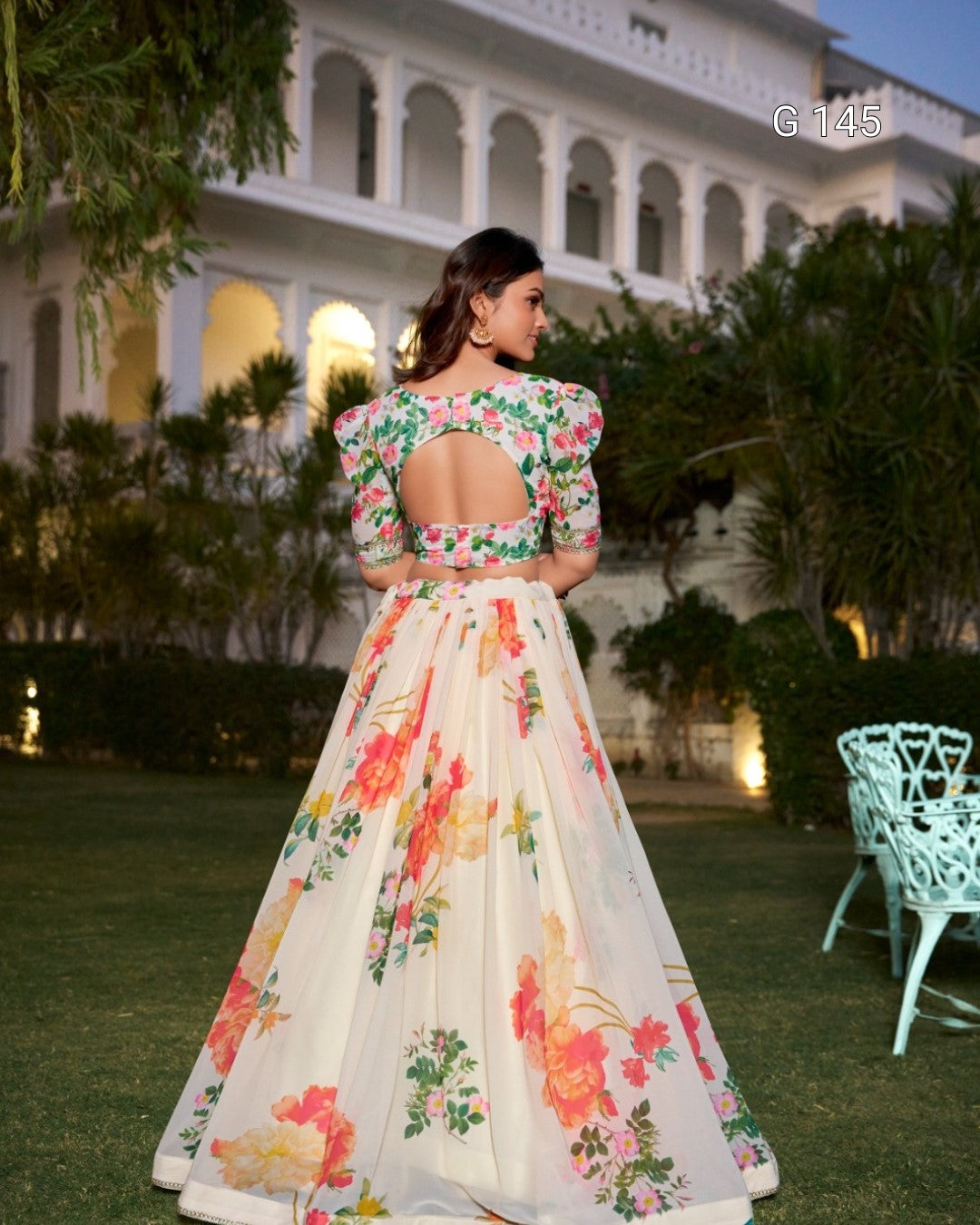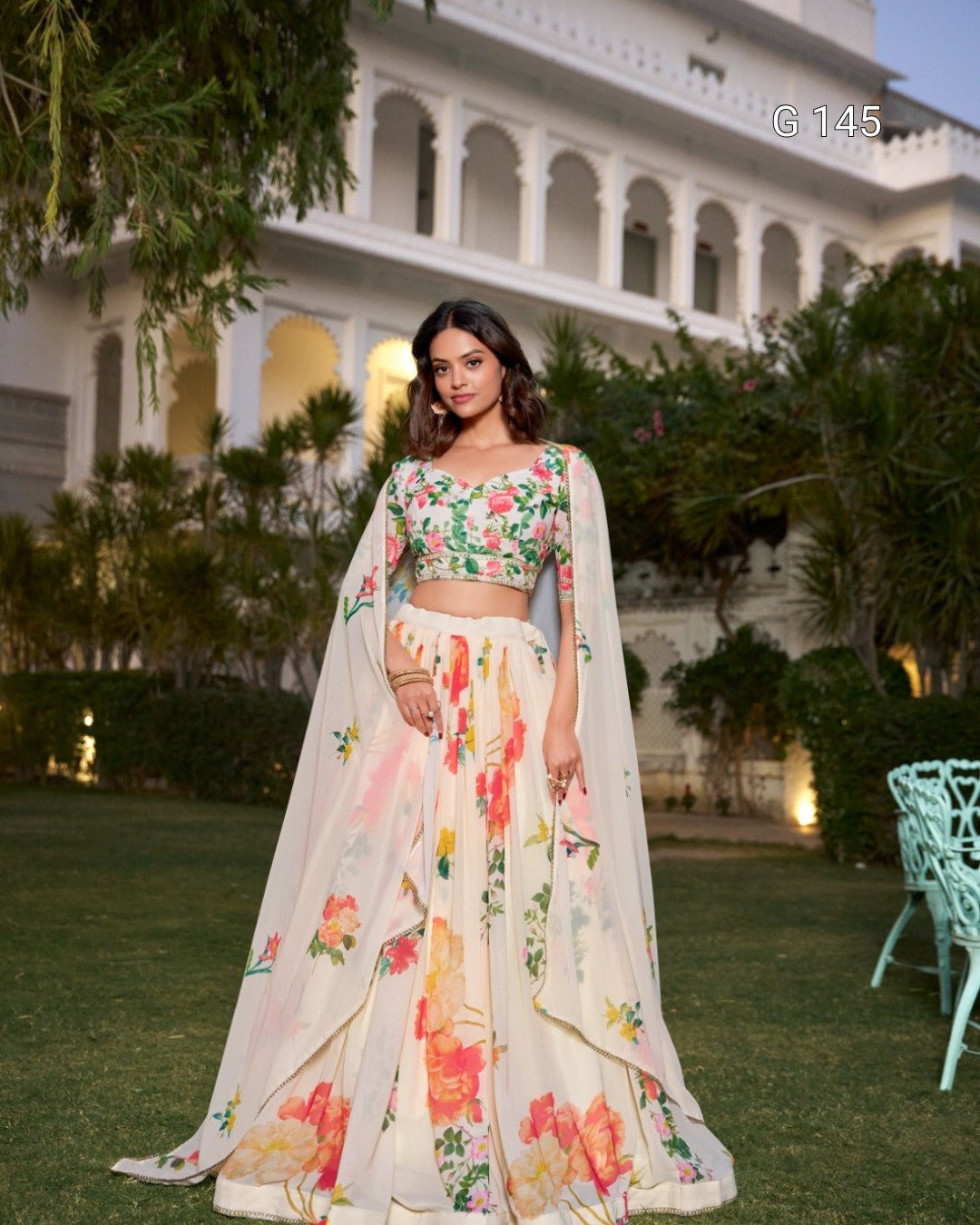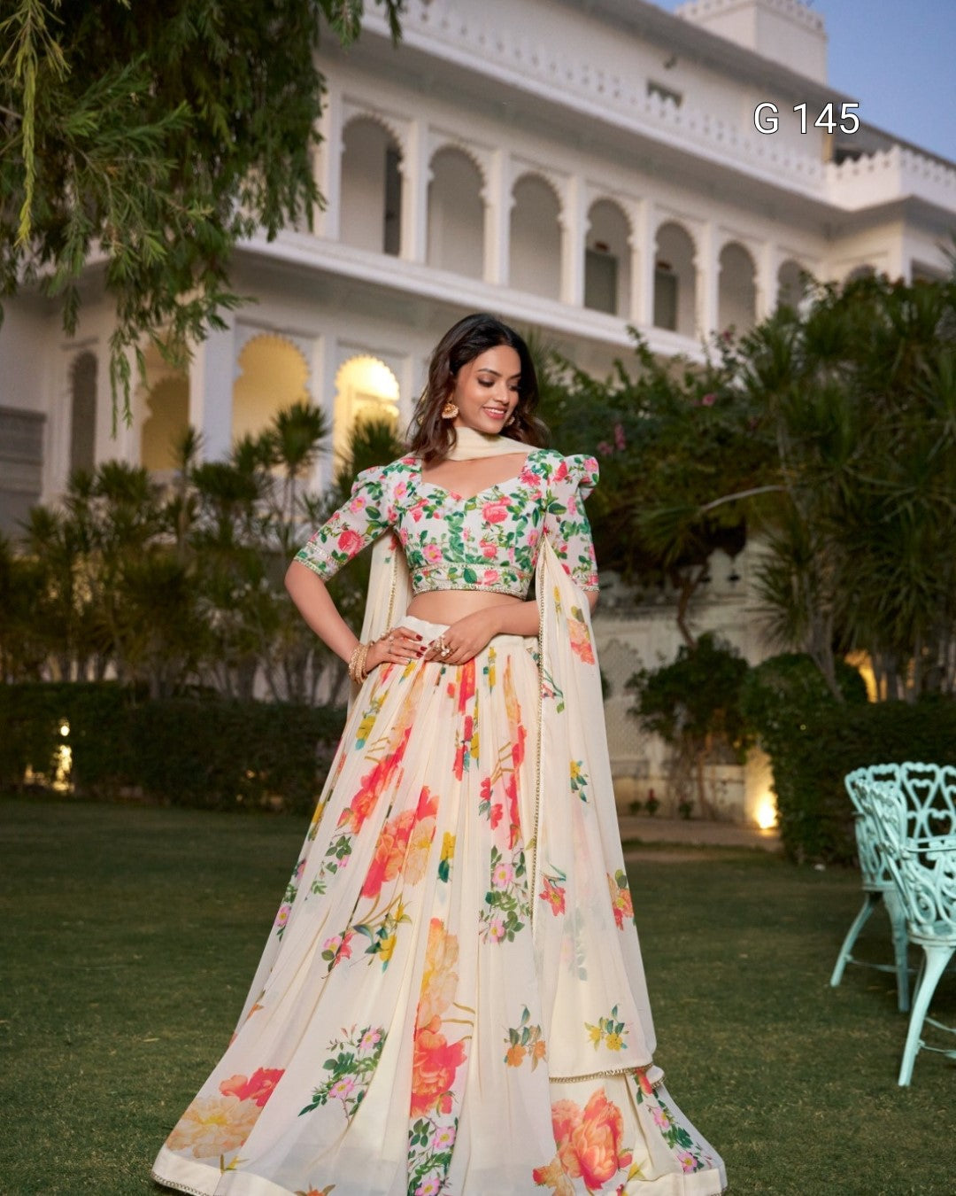 Cream Georgette Lehenga with Floral Print & Lace Border – Wedding Lehenga Set-G 145 Cream