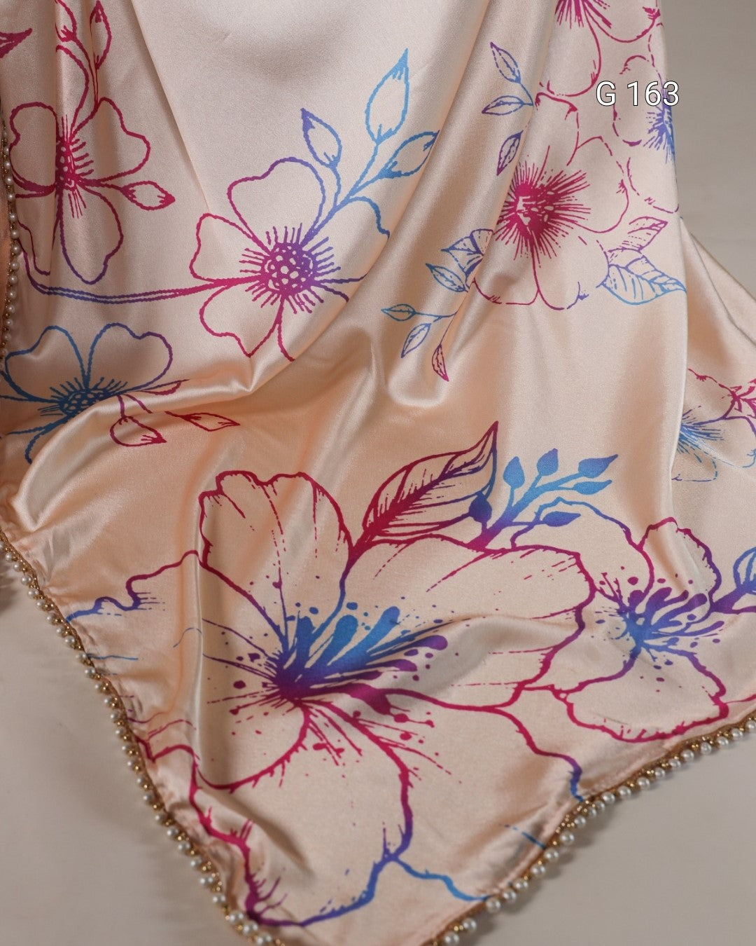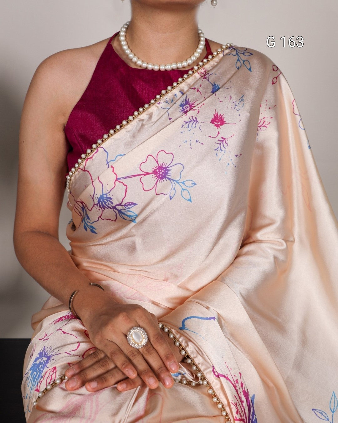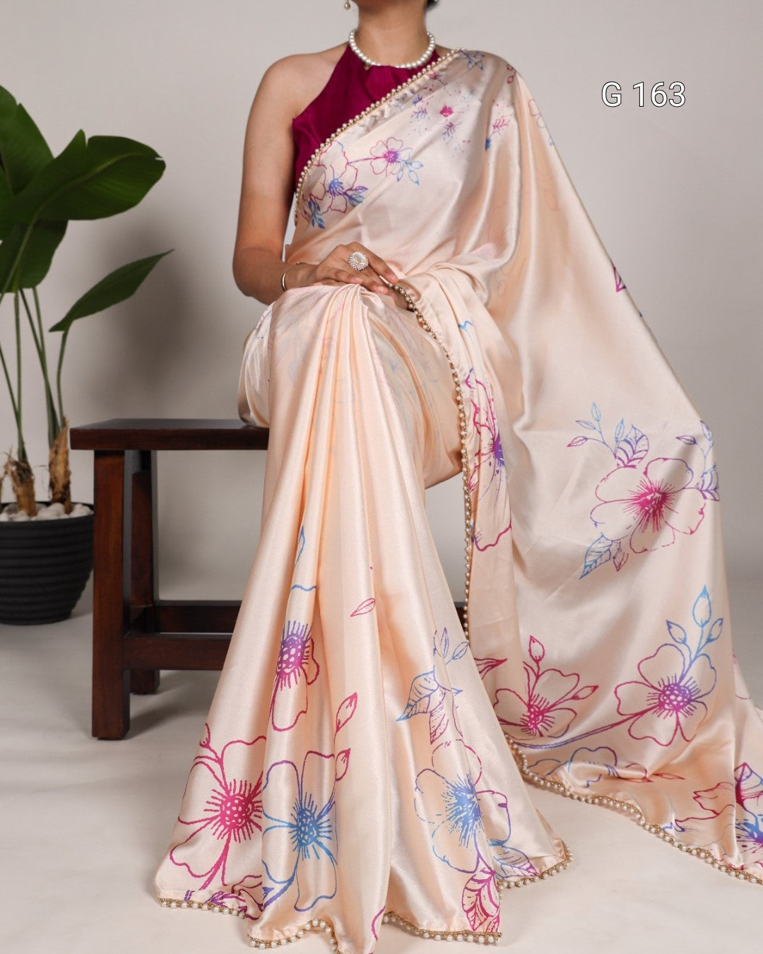 Cream Satin Silk Saree with Floral Print & Pearl Lace Border-G 163 Cream