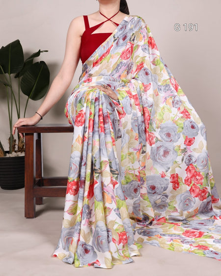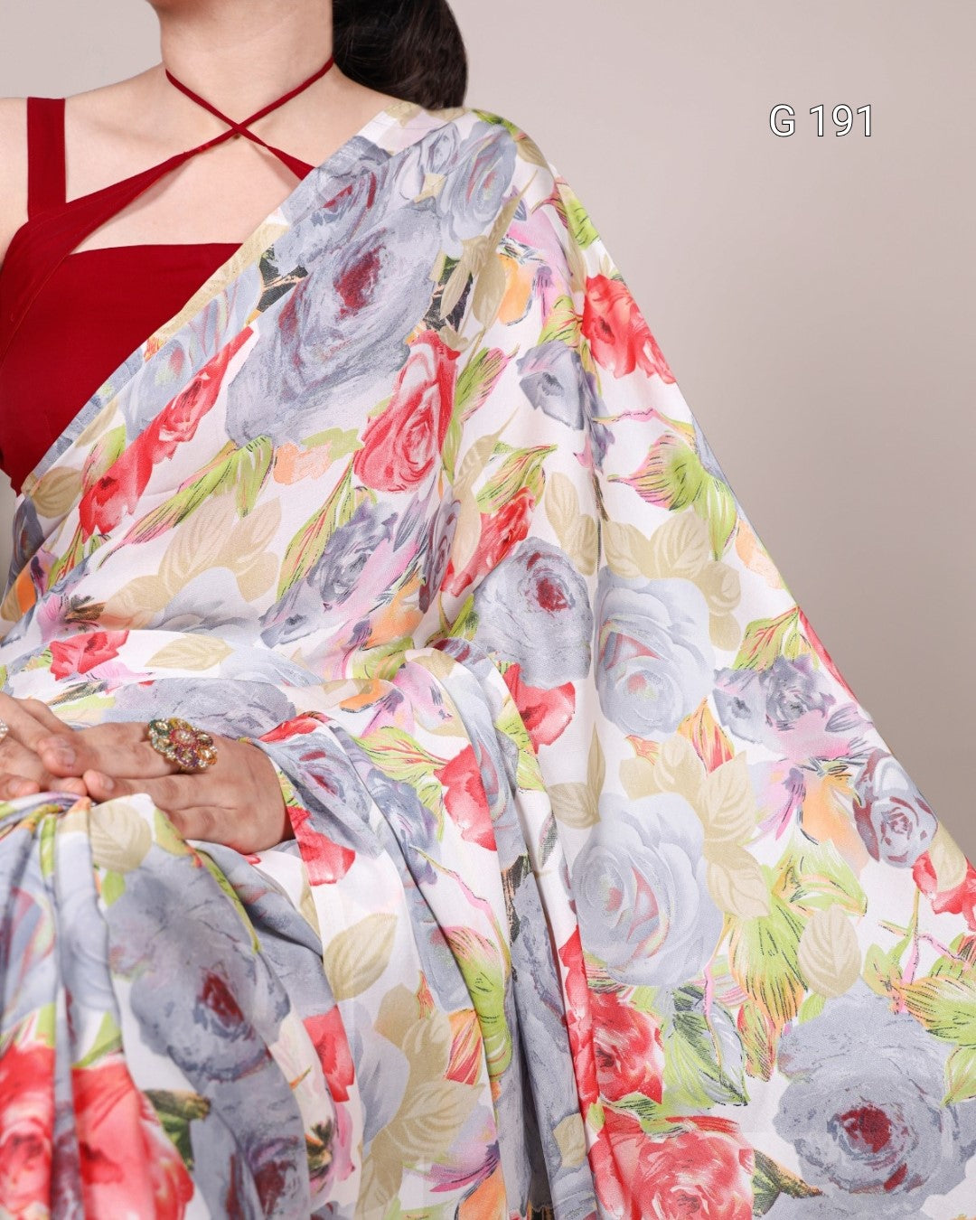 Dull Satin Floral Printed Saree with Moonga Silk Blouse – G 191 Gray