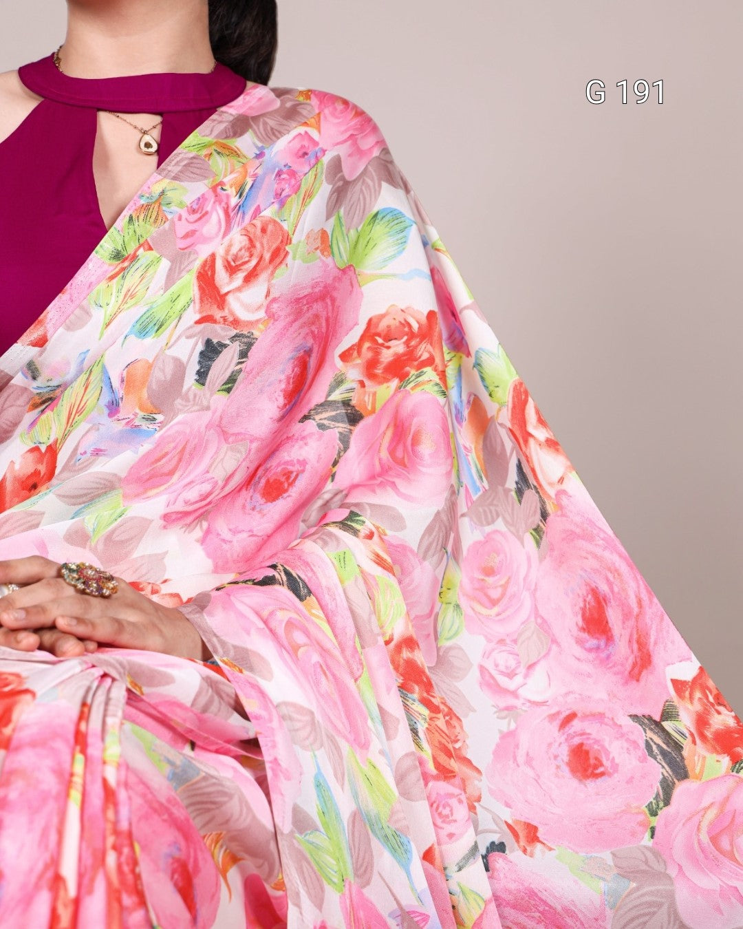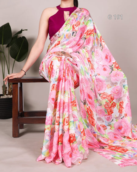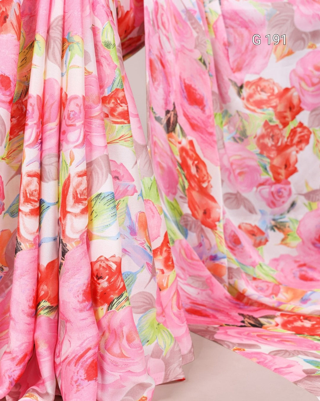 Dull Satin Floral Printed Saree with Moonga Silk Blouse – G 191 Light Pink