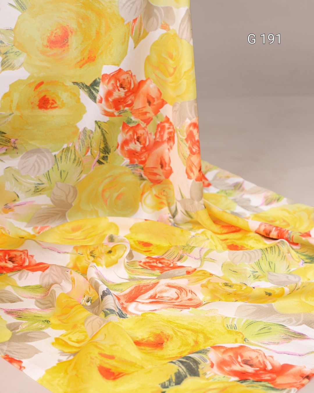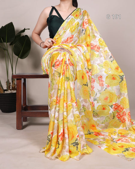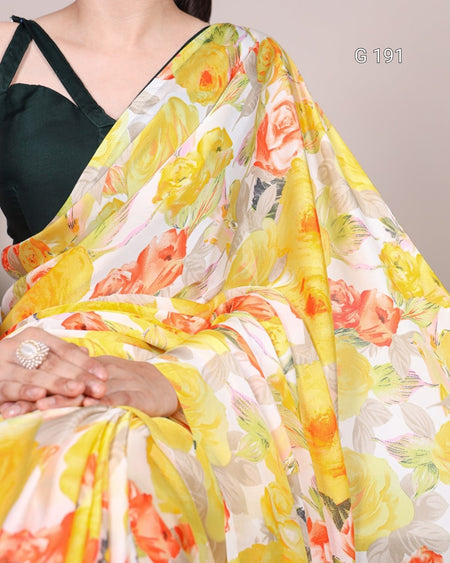Dull Satin Floral Printed Saree with Moonga Silk Blouse – G 191 Yellow