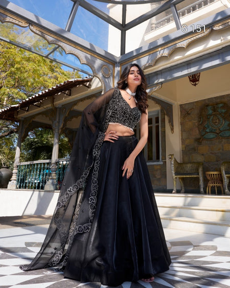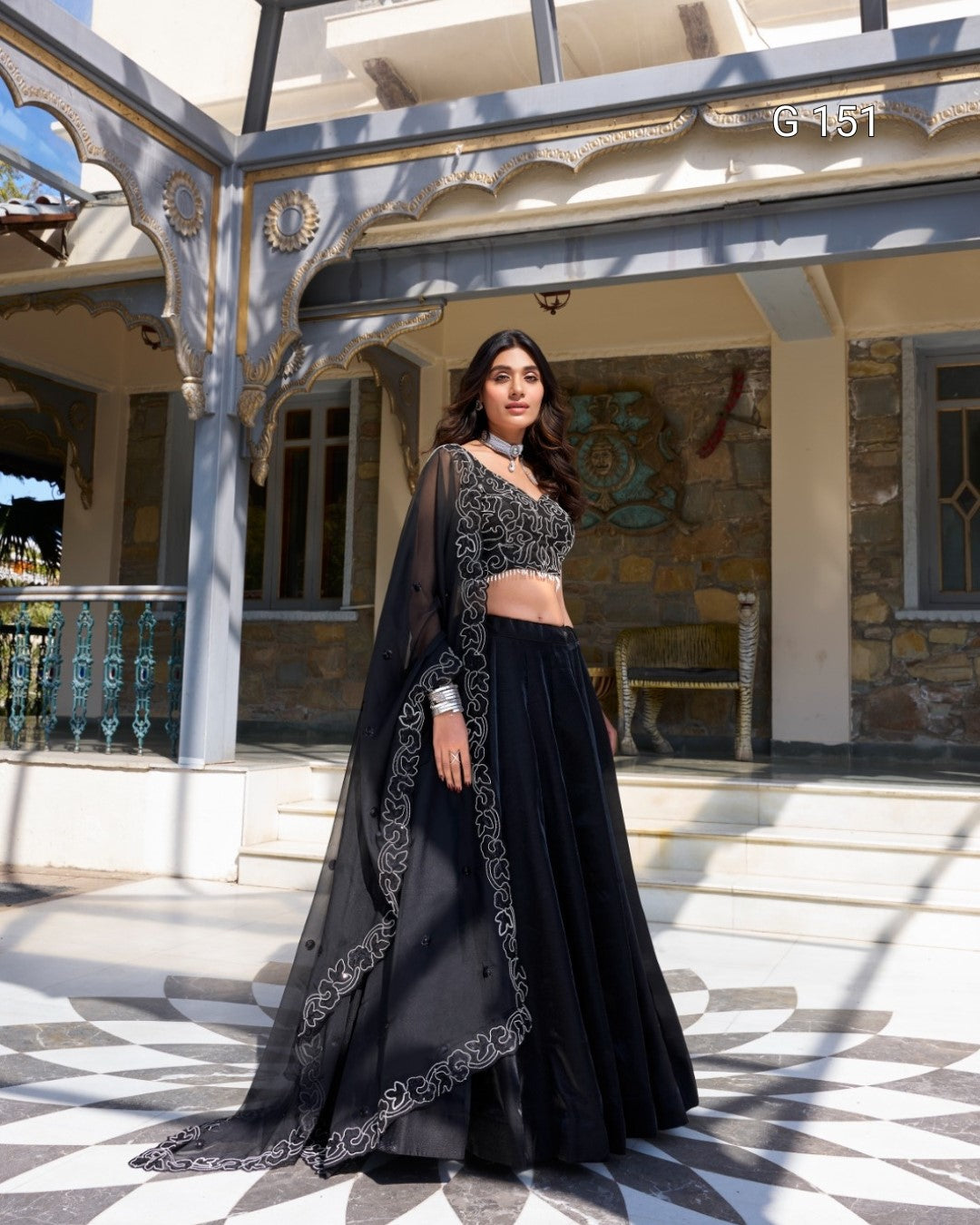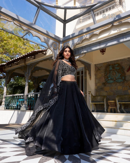 Elegant Black Star Satin Lehenga with Pearl & Sequins Embroidery – Bridal Lehenga Set-G 151 Black