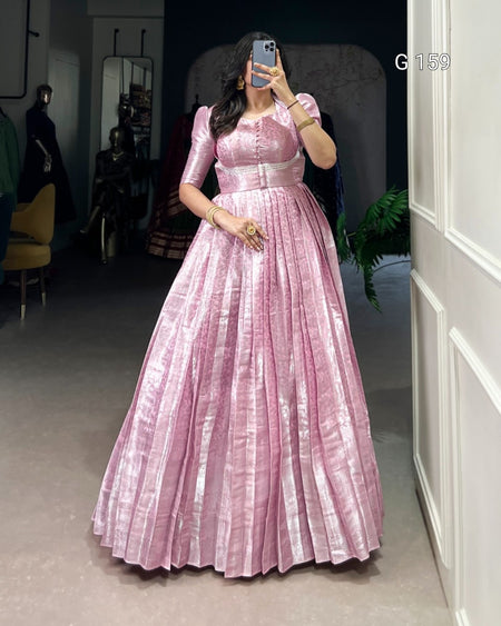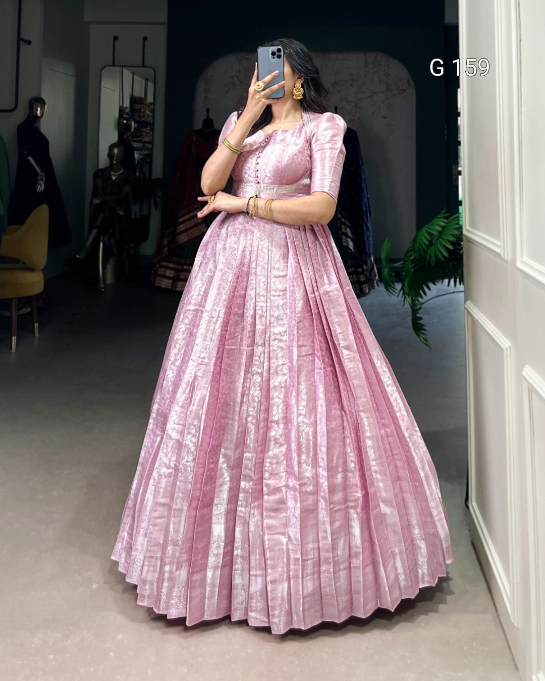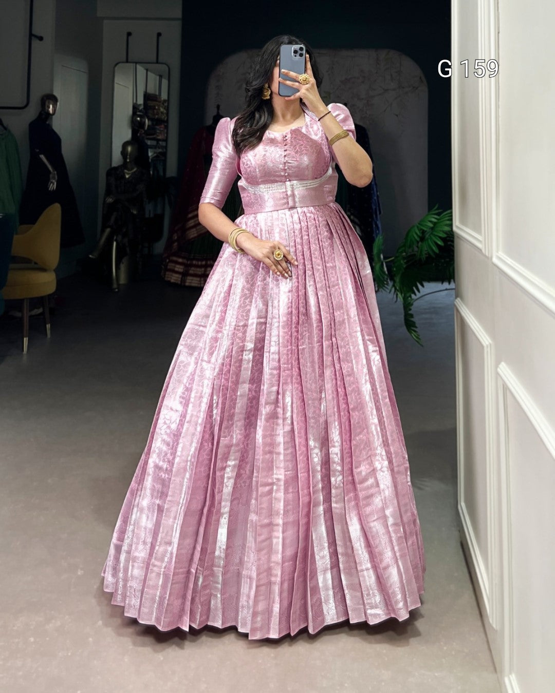 Elegant Light Pink Kanjivaram Gown & Koti Set with Zari Weaving & Lace Touch Up-G 159 Light Pink