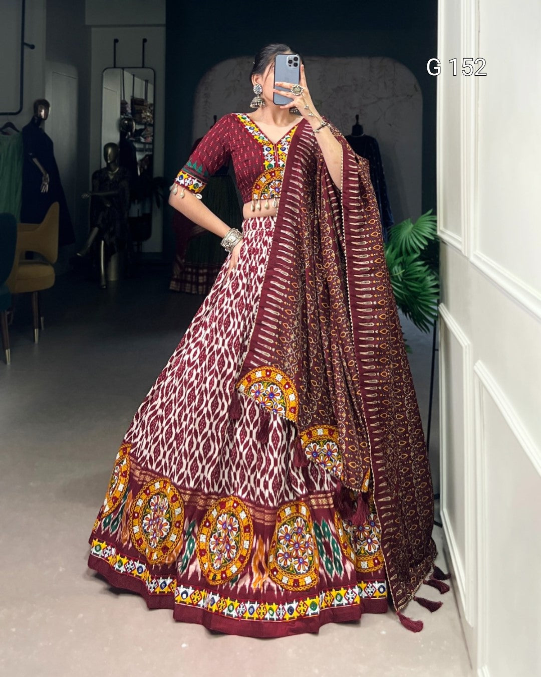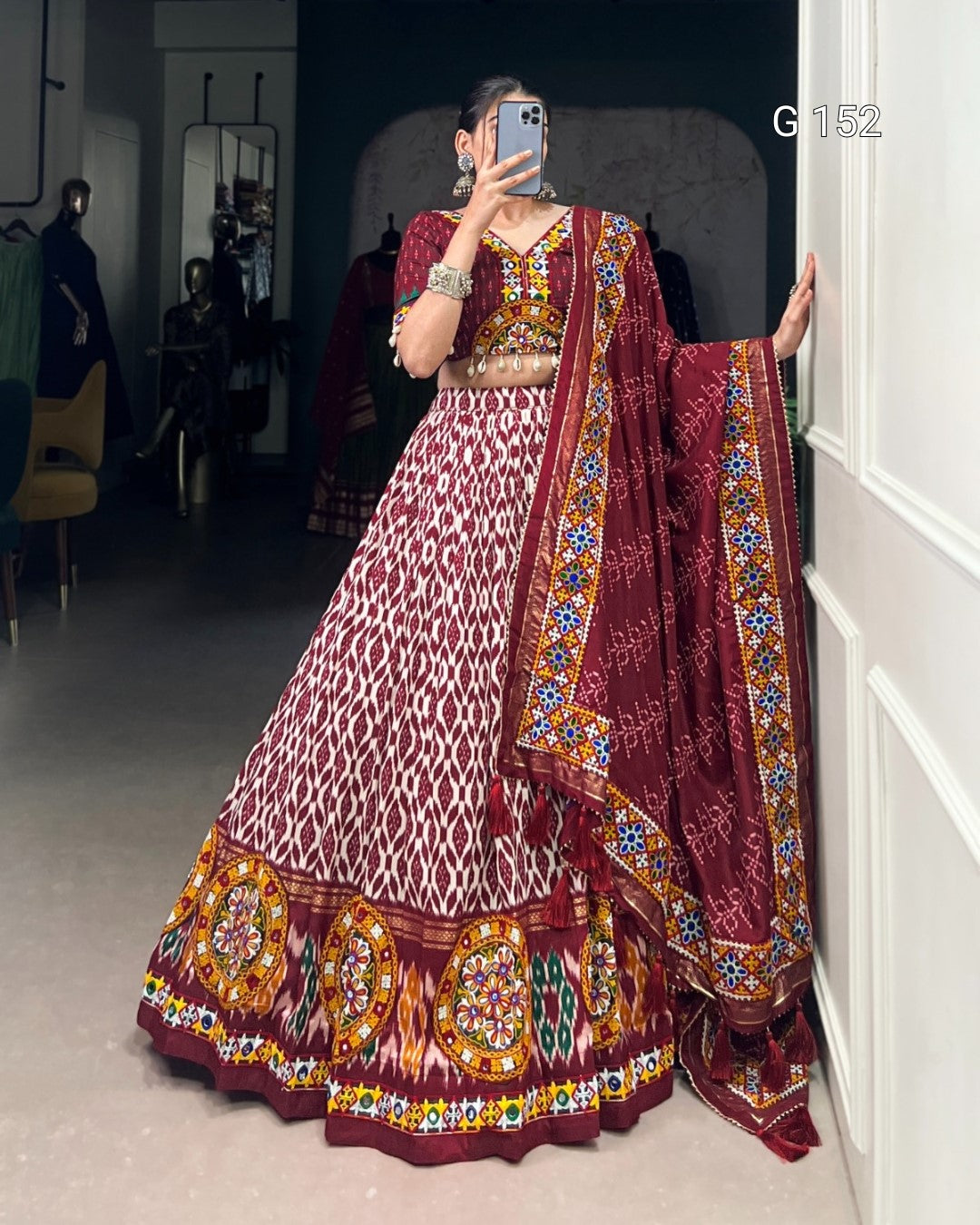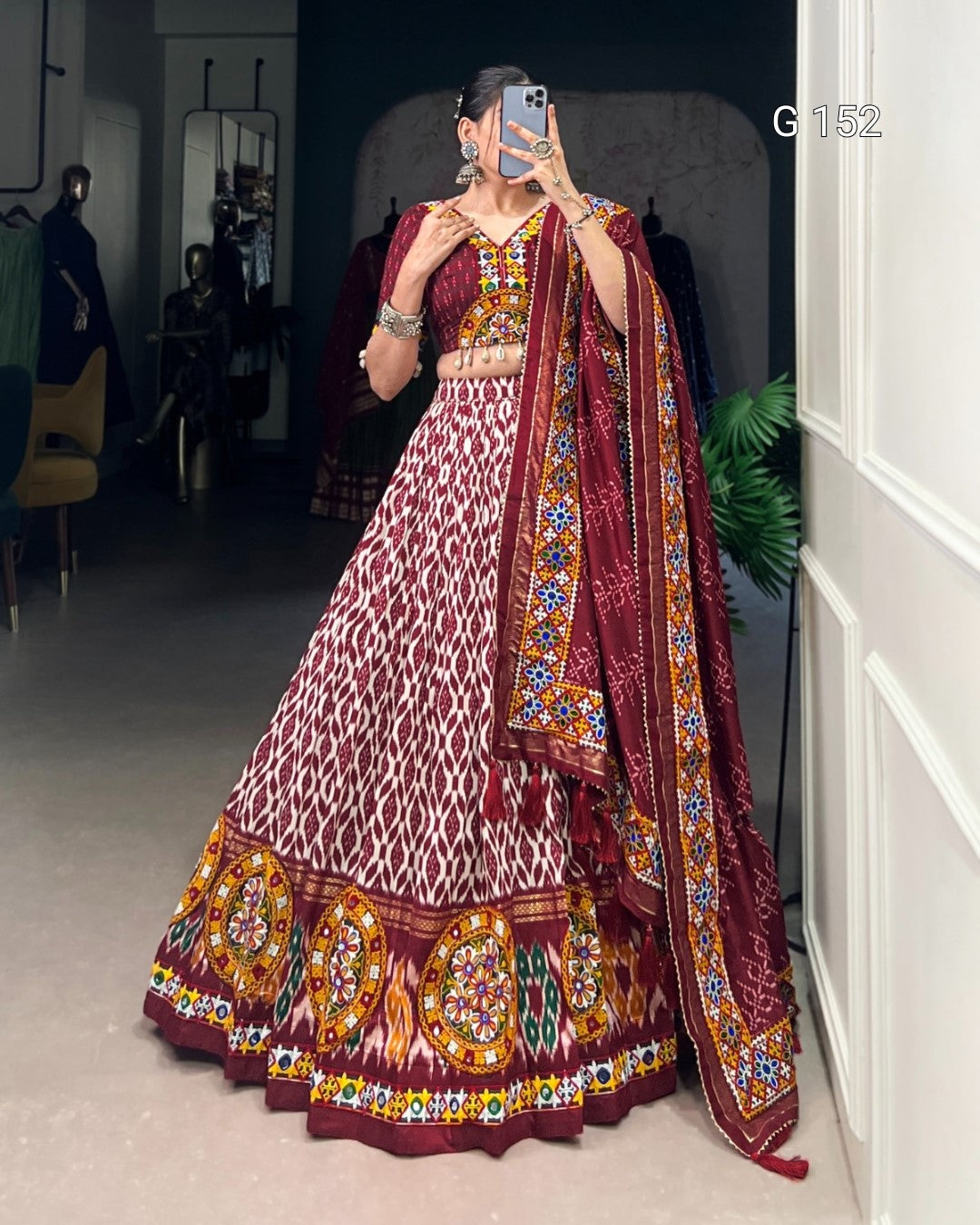 Elegant Maroon Tussar Silk Lehenga with Ikkat Print & Mirror Gamthi Work – Wedding Lehenga Set-G 152 Maroon