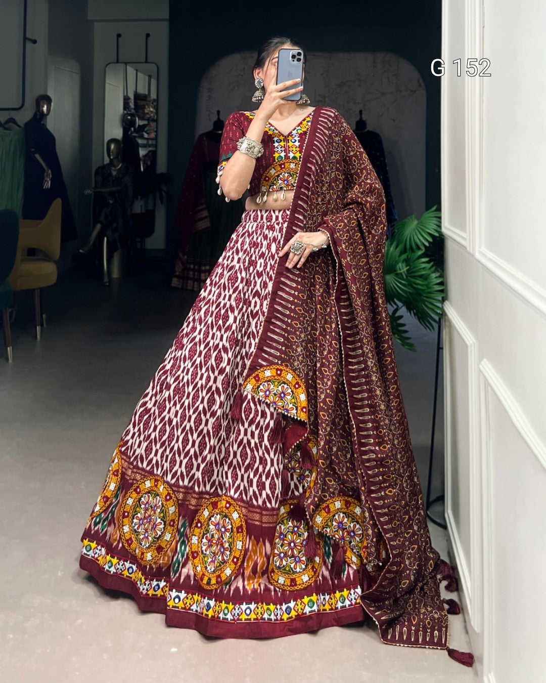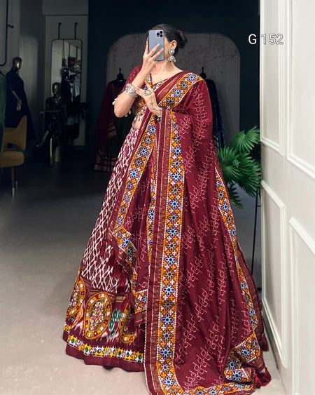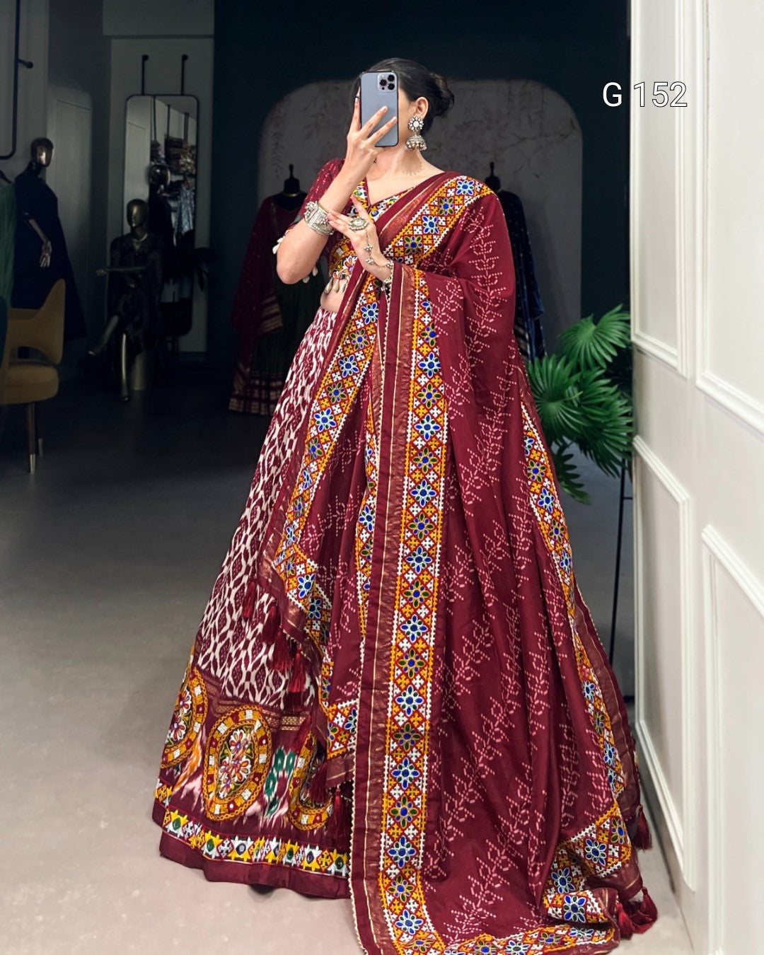 Elegant Maroon Tussar Silk Lehenga with Ikkat Print & Mirror Gamthi Work – Wedding Lehenga Set-G 152 Maroon