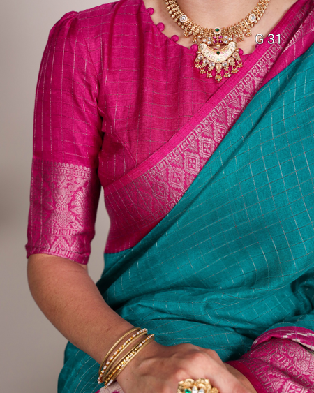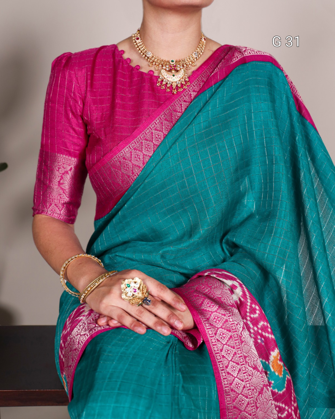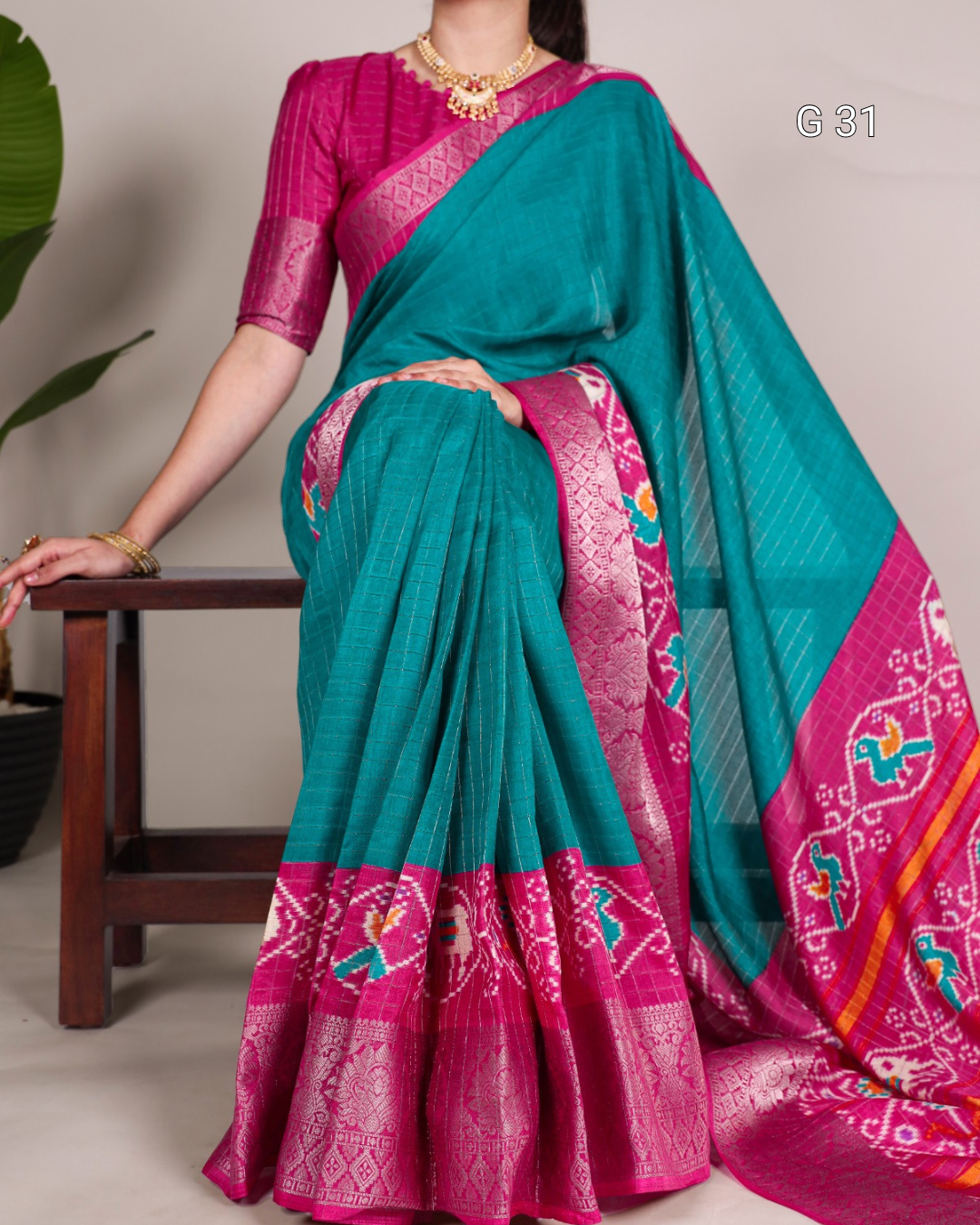 Firozi Tasar Chex Saree with Patola Print & Weaving Work Border – G 31 Firozi