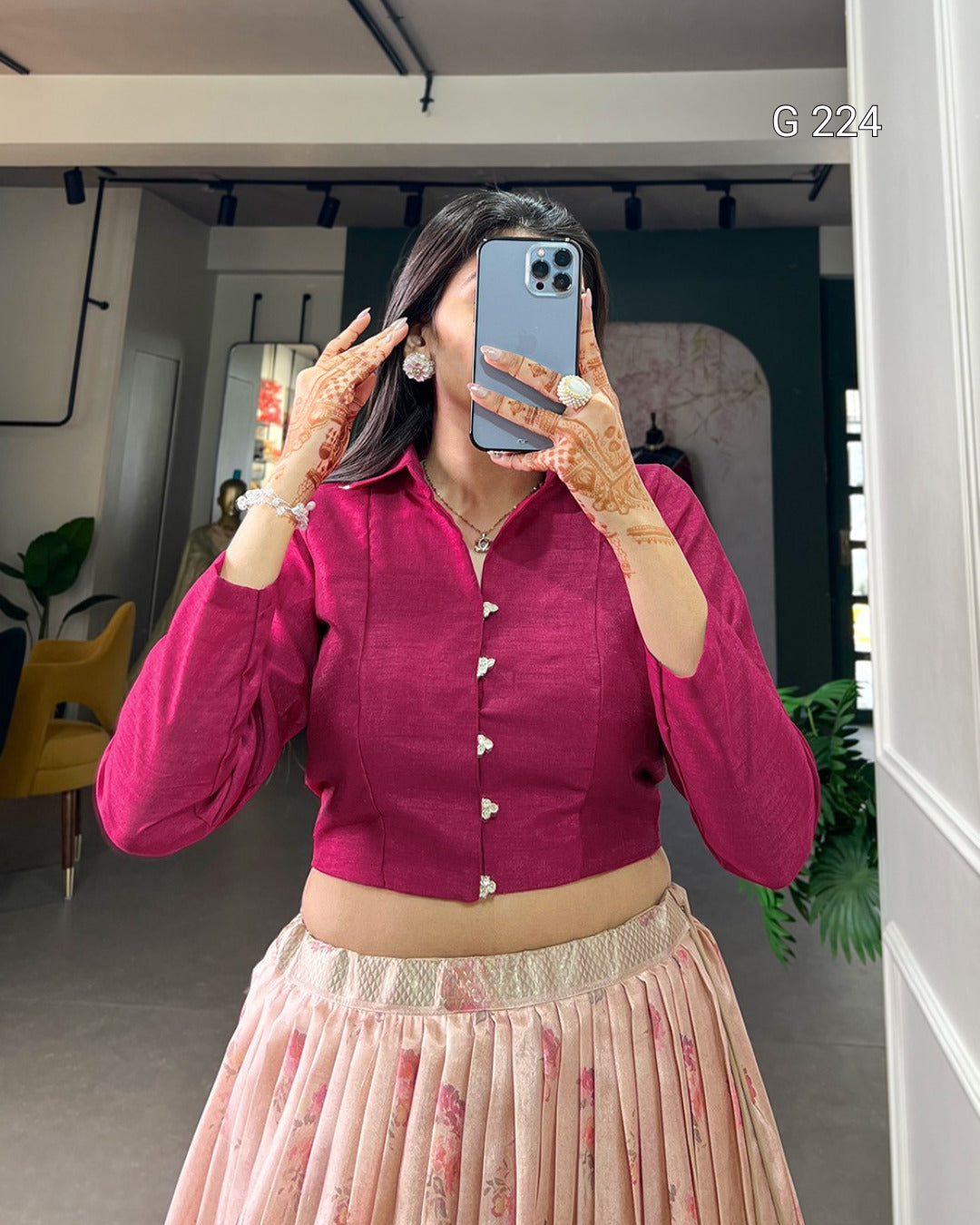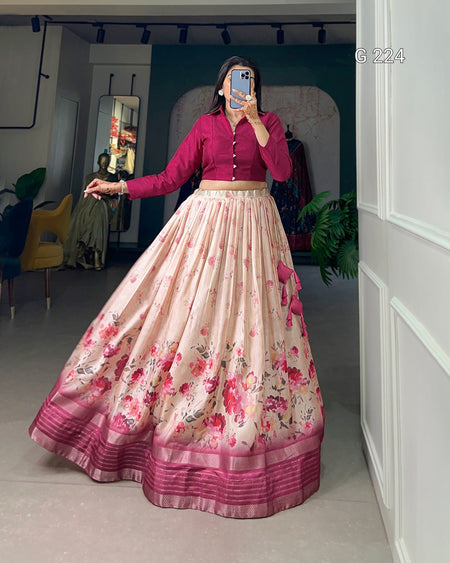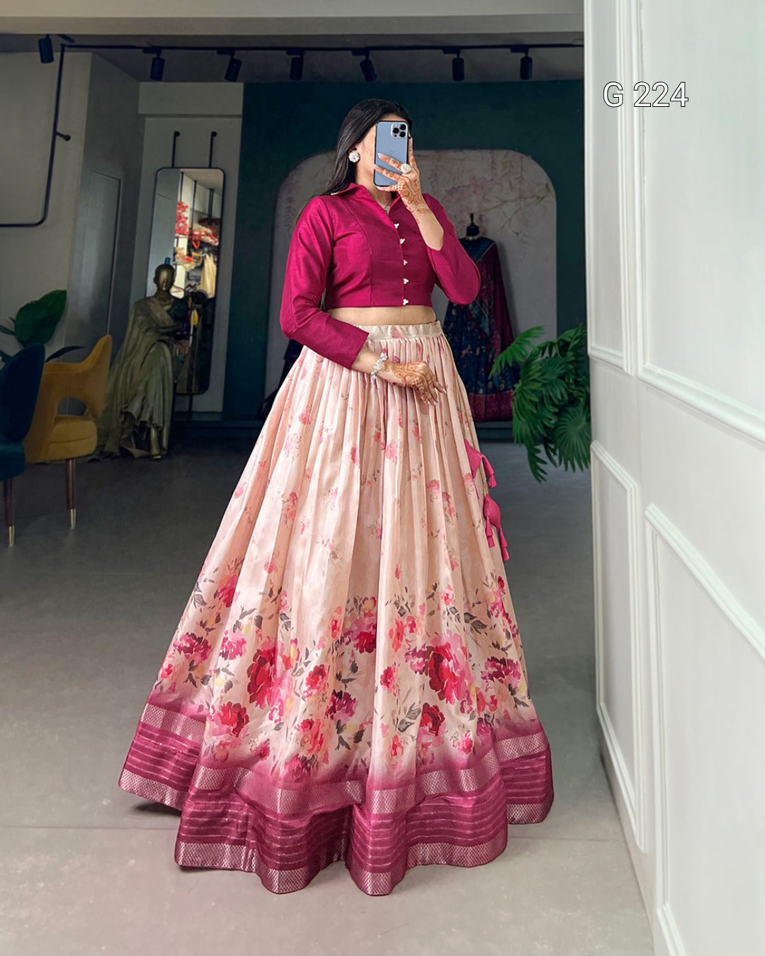Floral Print Dola Silk Lehenga with Sequins & Zari Border – G 224 Rani Pink