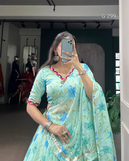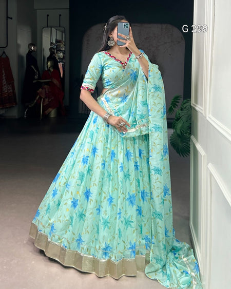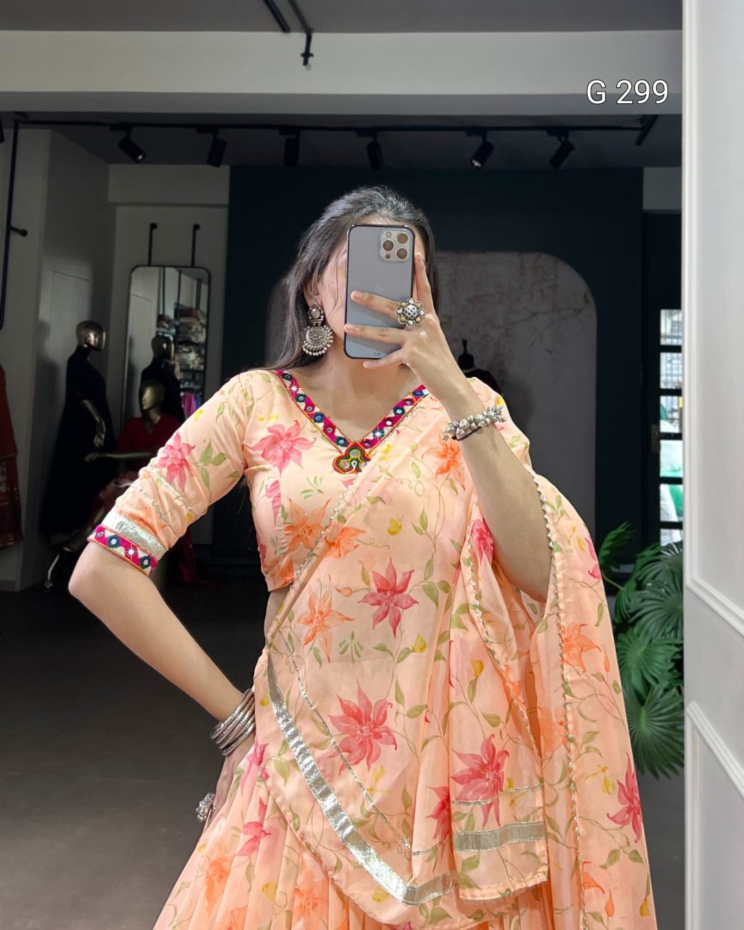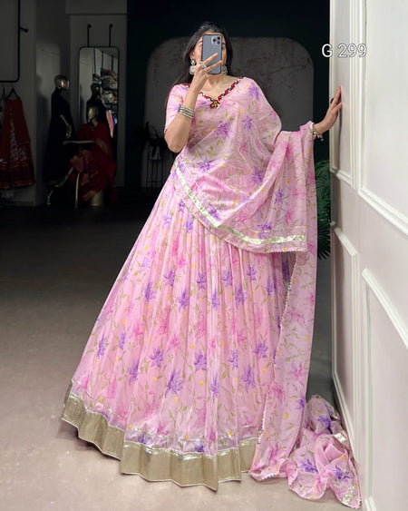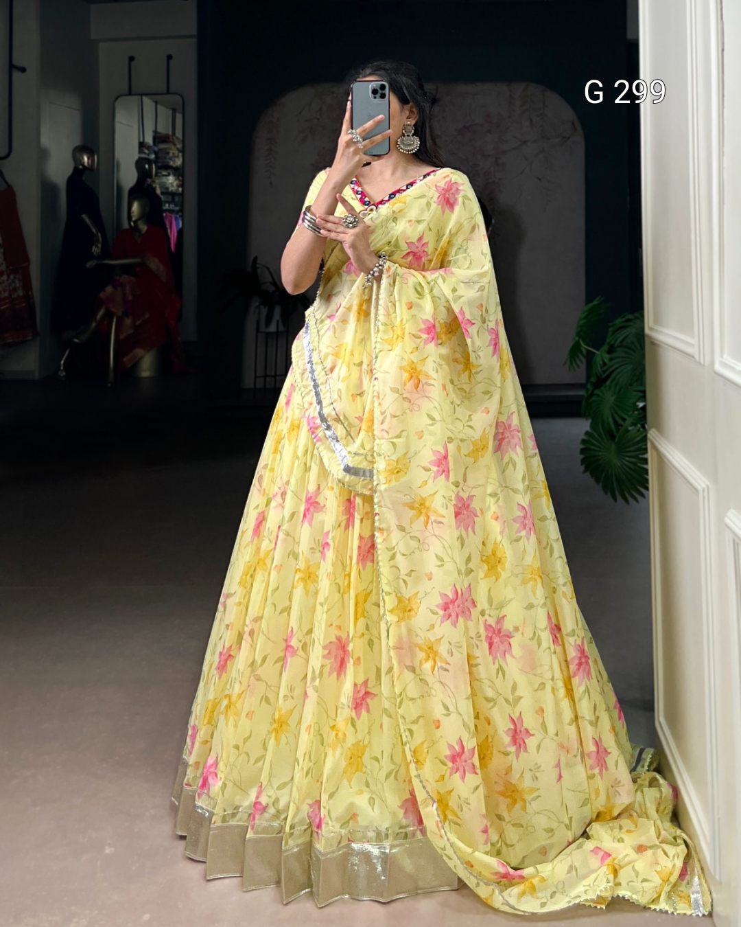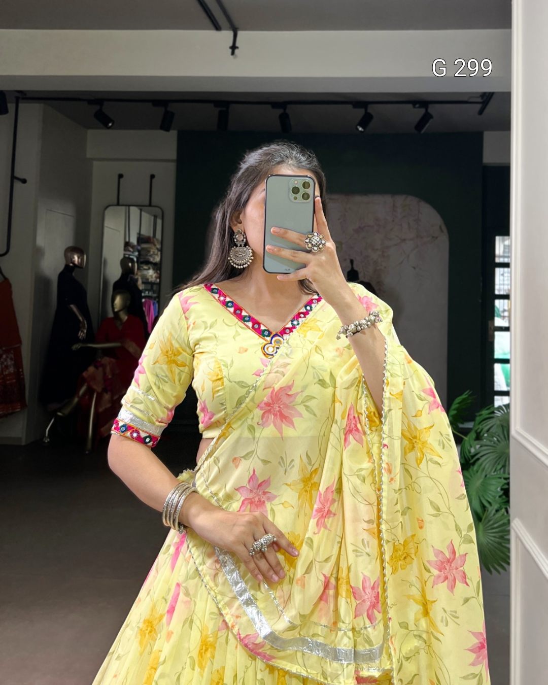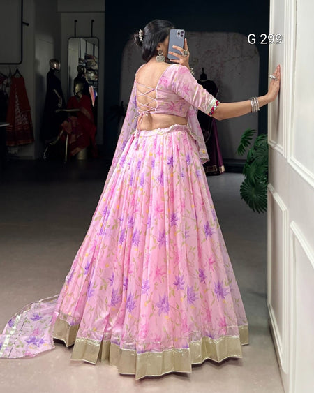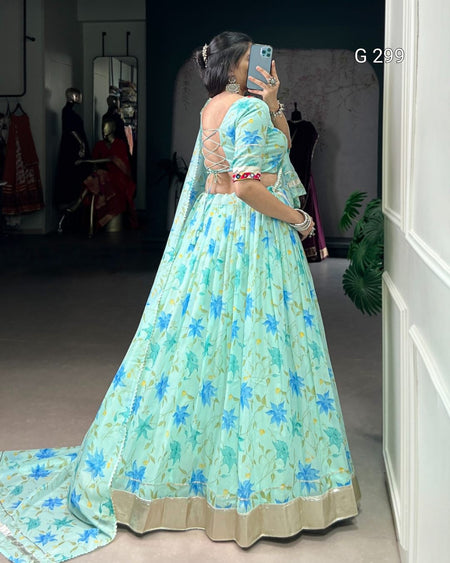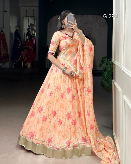 Floral Print Tabby Silk Lehenga with Lace & Mirror Work – G 299