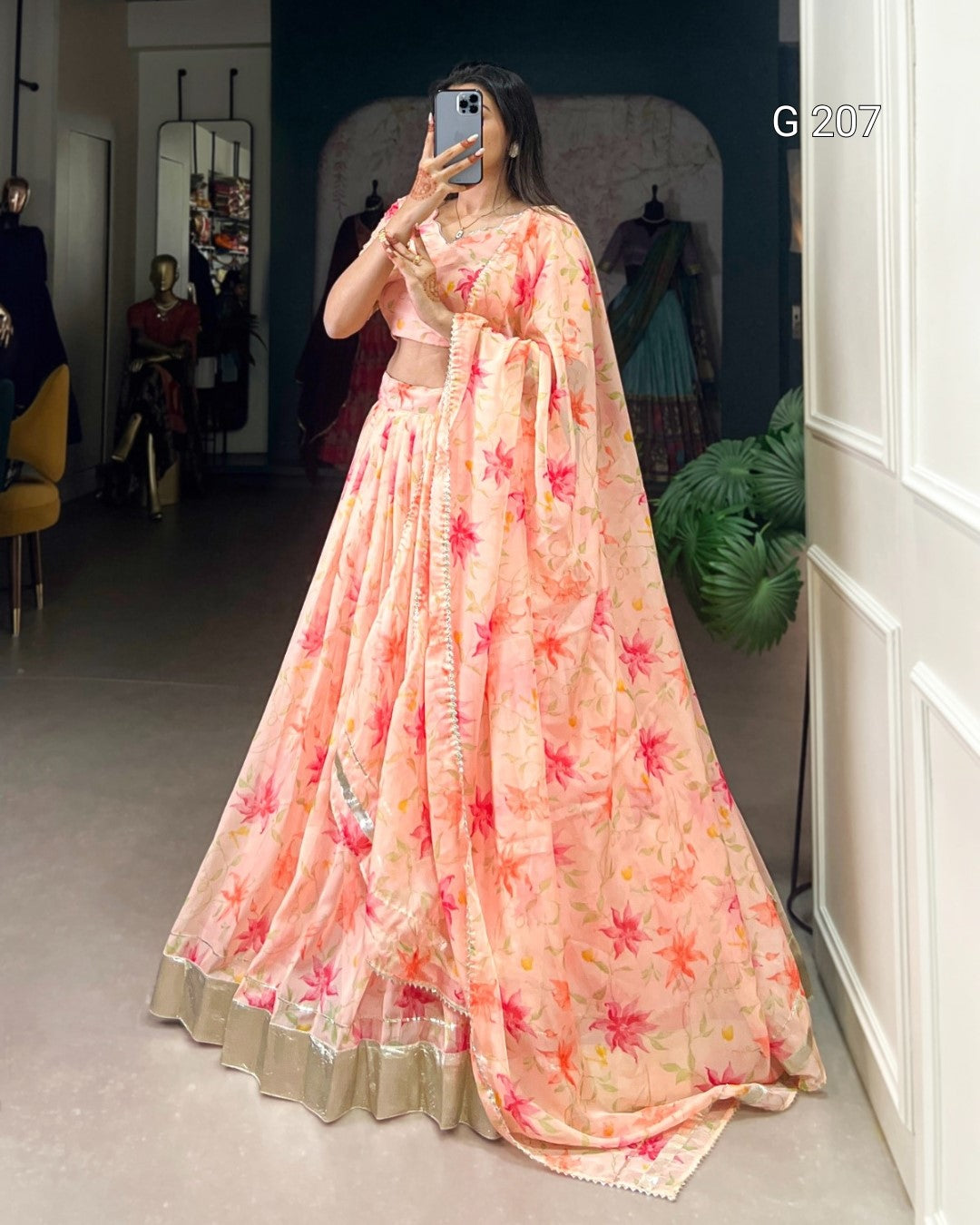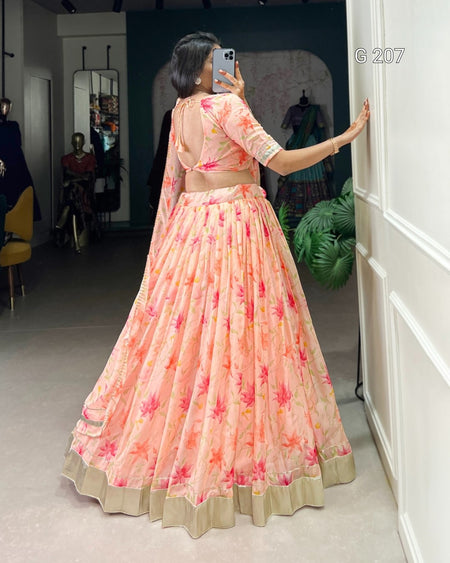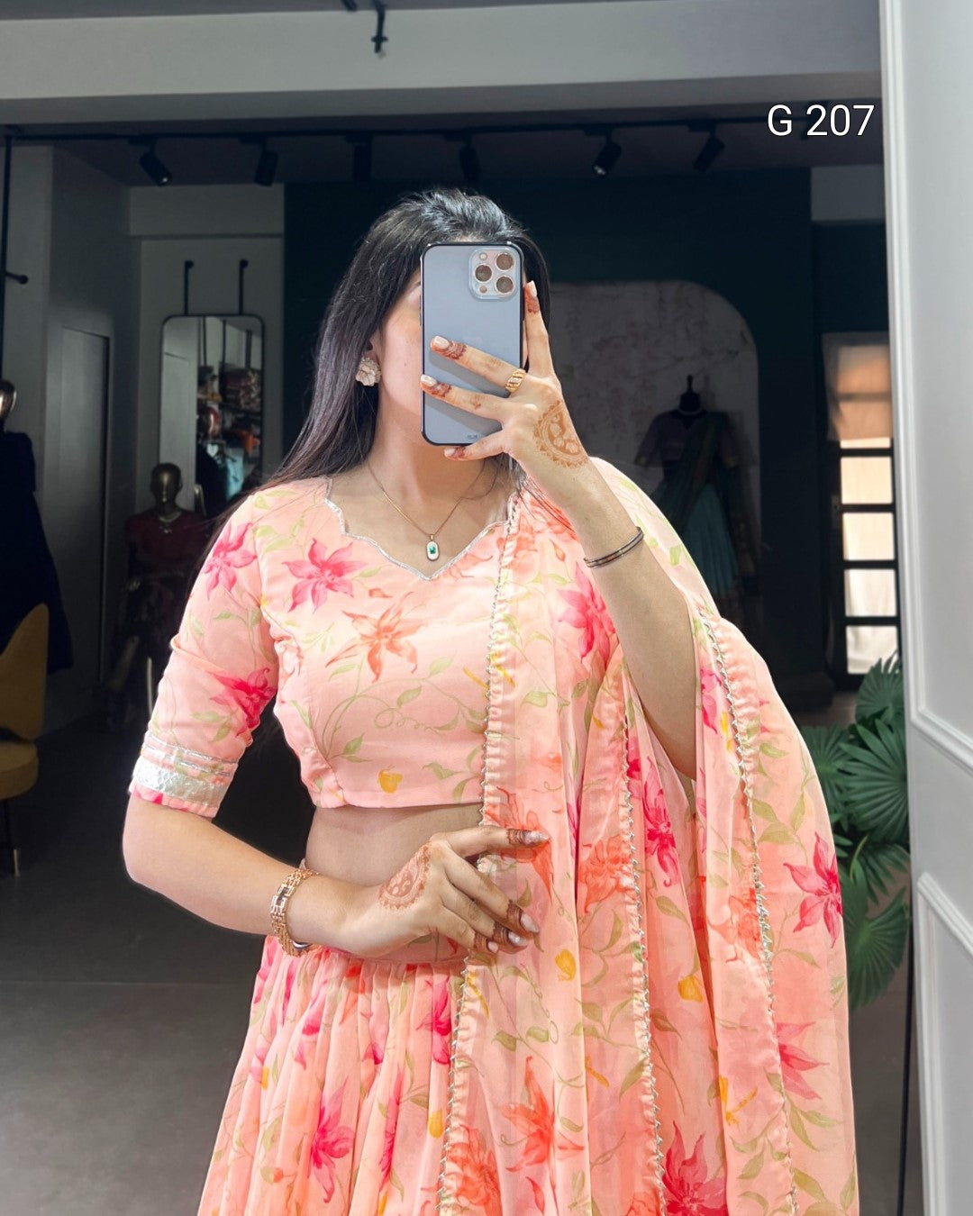 Floral Print Tabby Silk Lehenga with Lace Touch Up – G 207 Peach
