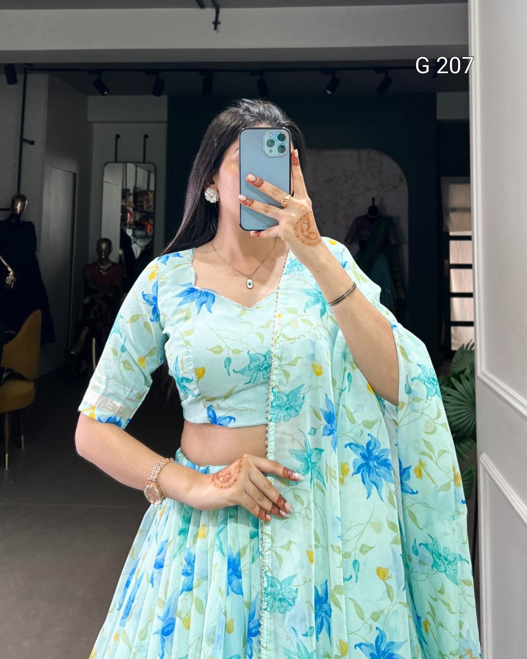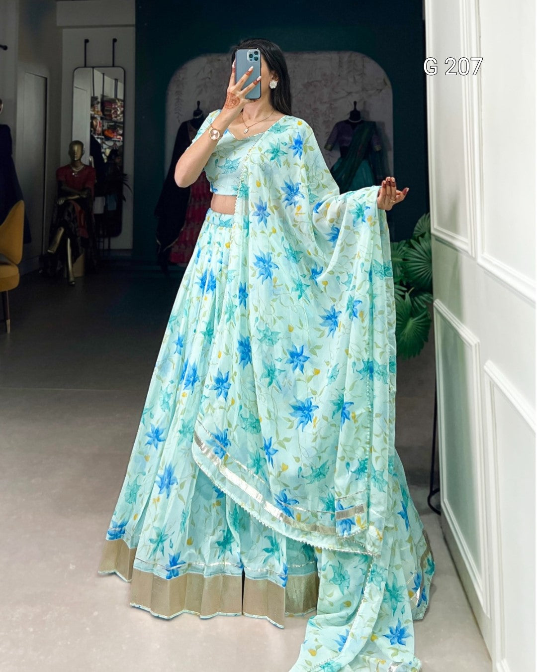 Floral Print Tabby Silk Lehenga with Lace Touch Up – G 207 Pista