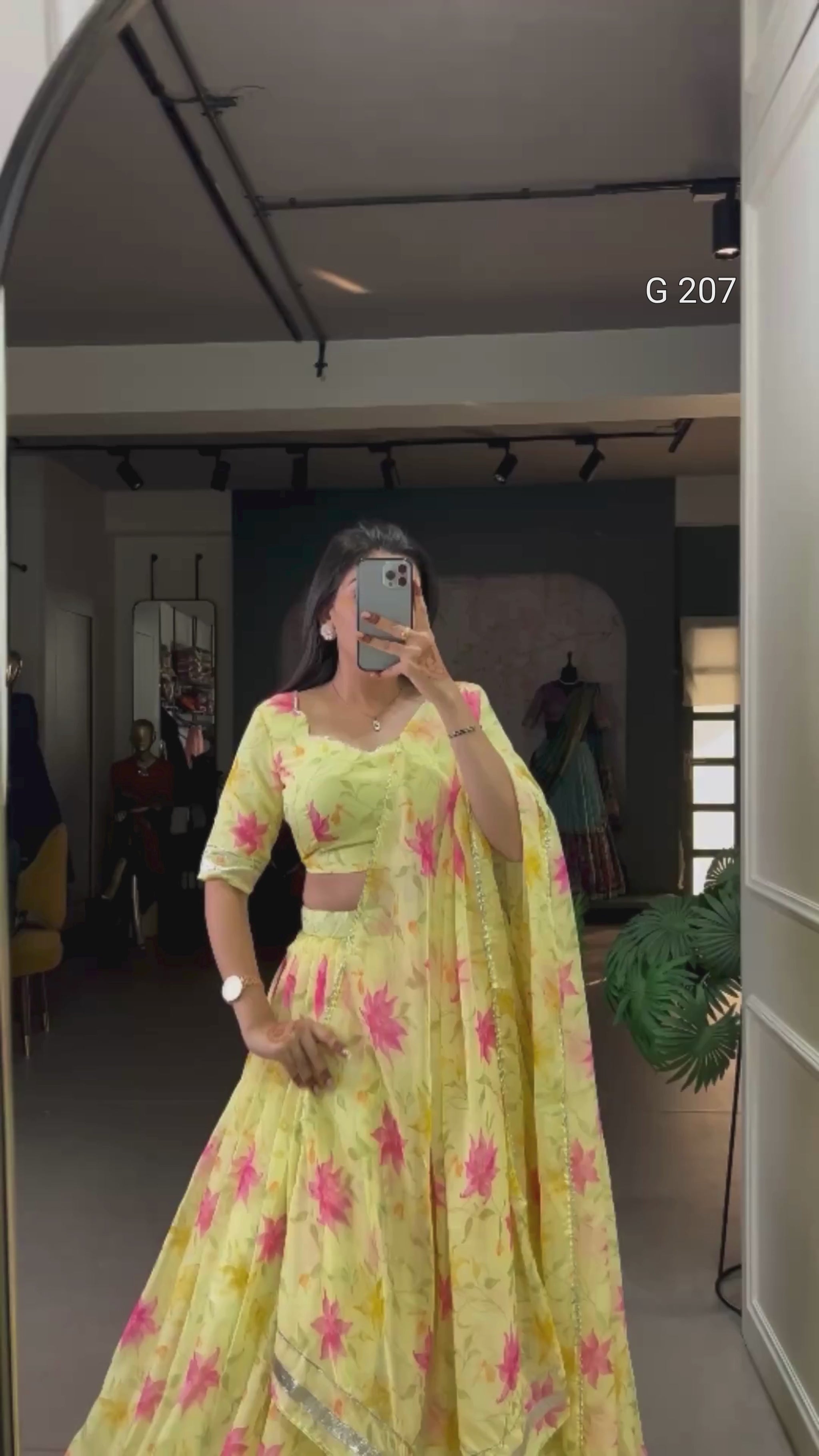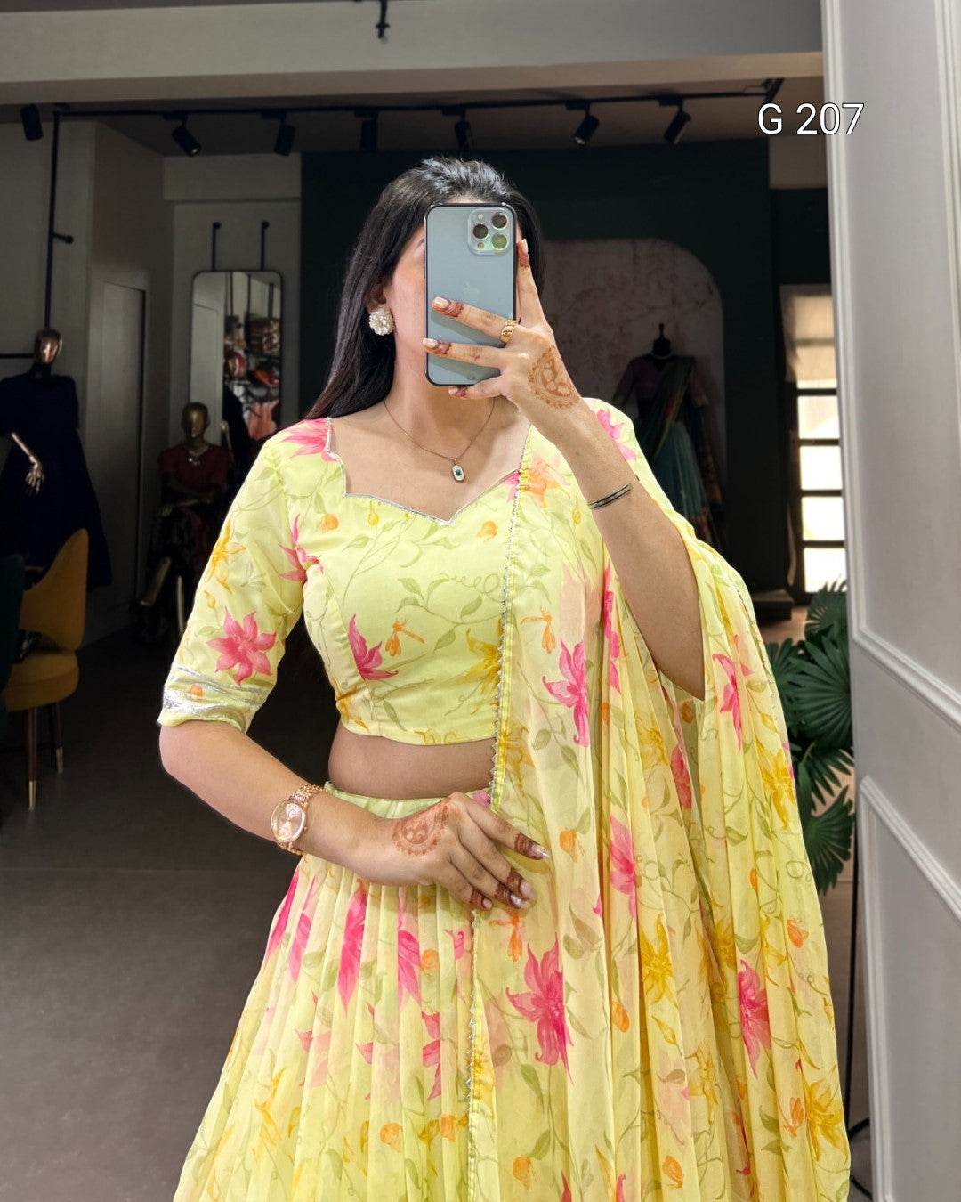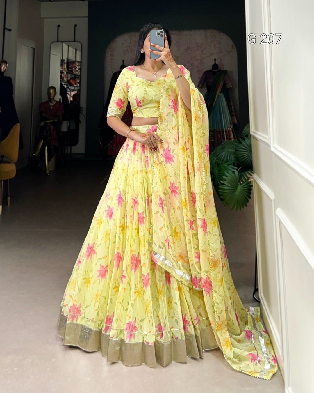 Floral Print Tabby Silk Lehenga with Lace Touch Up – G 207 Yellow