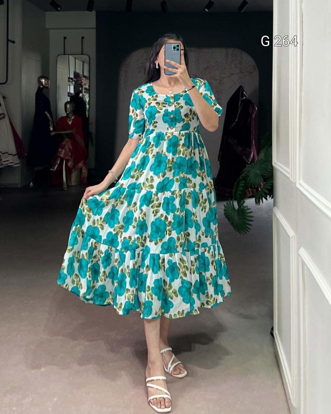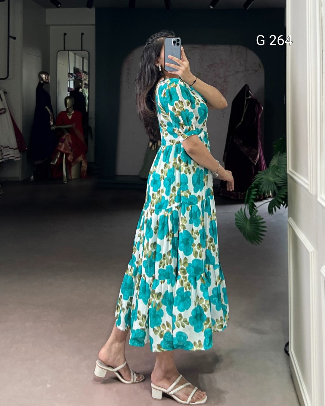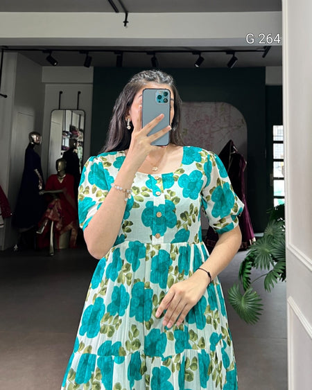 Floral Print Vichitra Silk Frock – G 264 Firozi