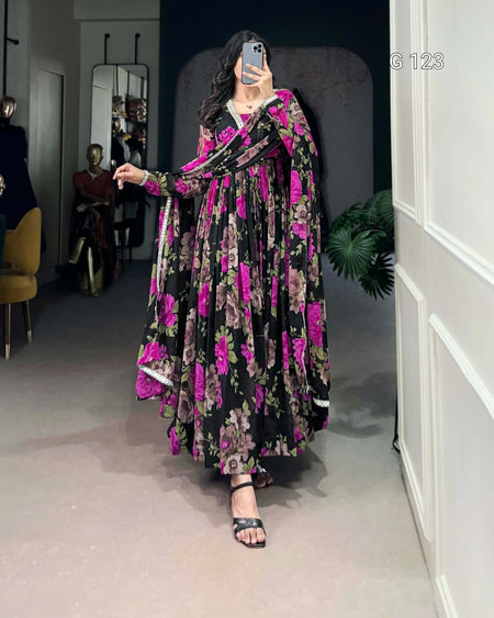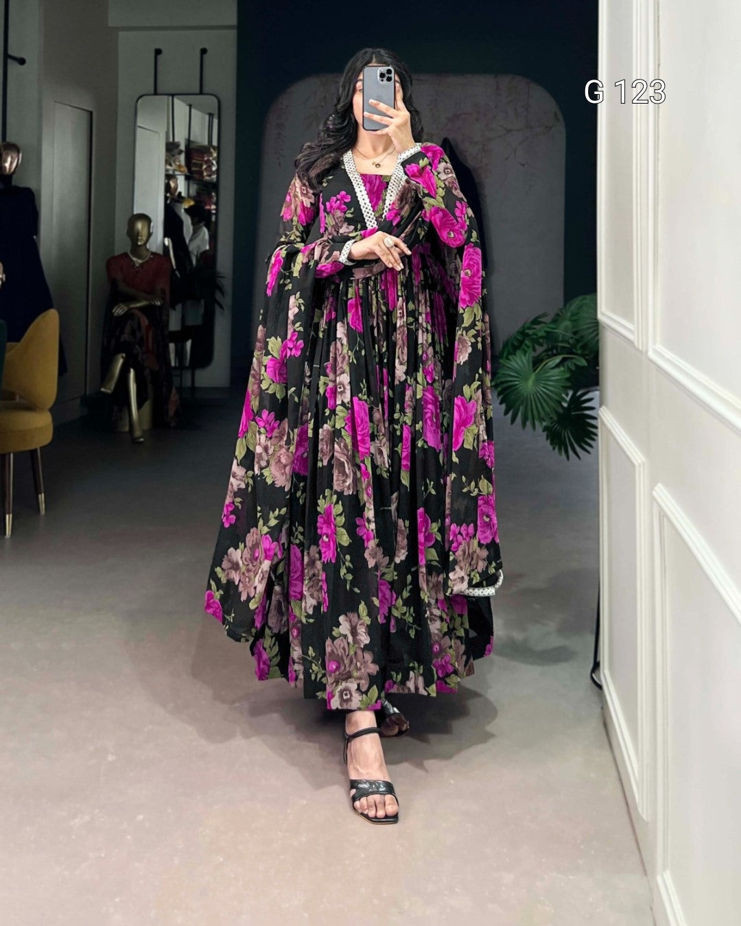 Floral Printed Georgette Gown with Peper Mirror Lace Touch Up – G 123 Pink
