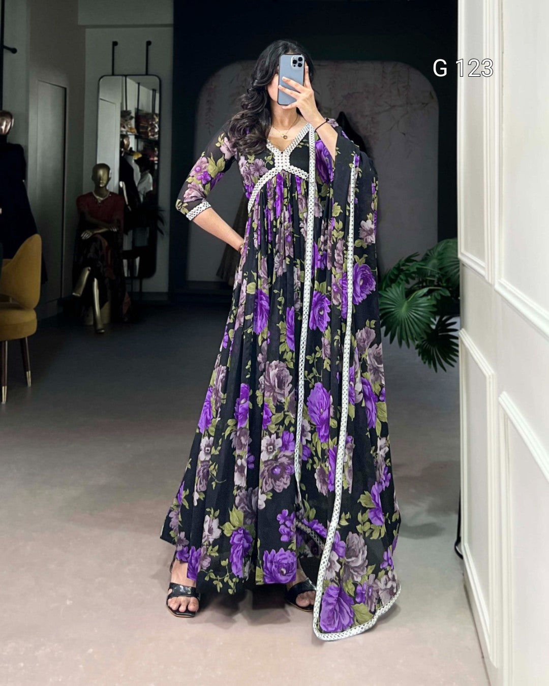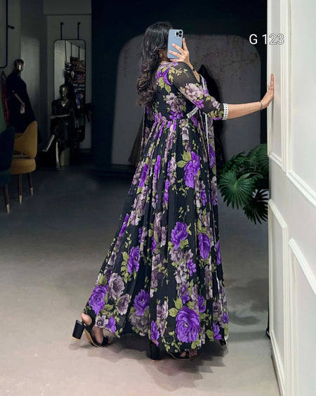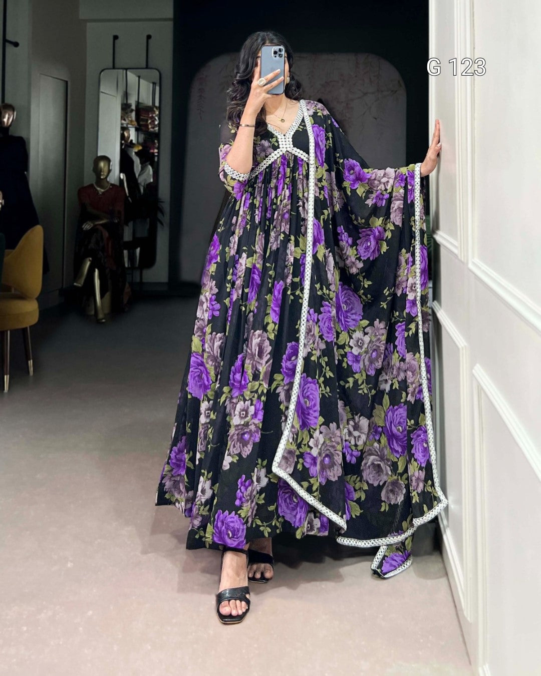 Floral Printed Georgette Gown with Peper Mirror Lace Touch Up – G 123 Purple
