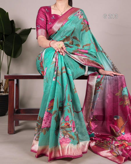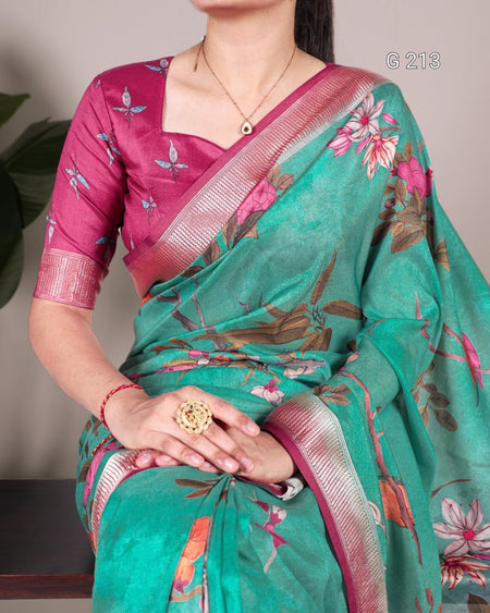 Floral Printed Tussar Silk Saree with Viscose Border – G 213 Green