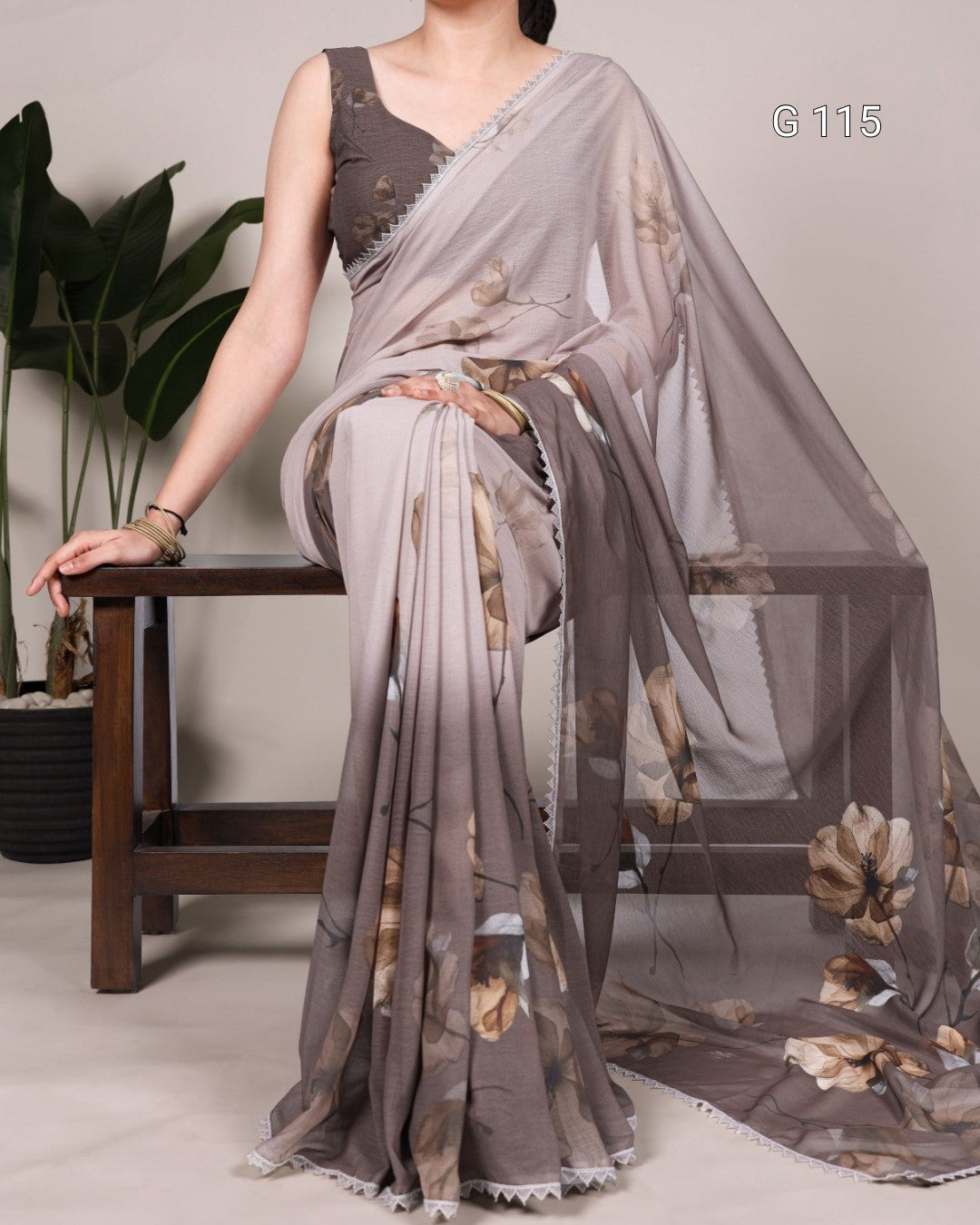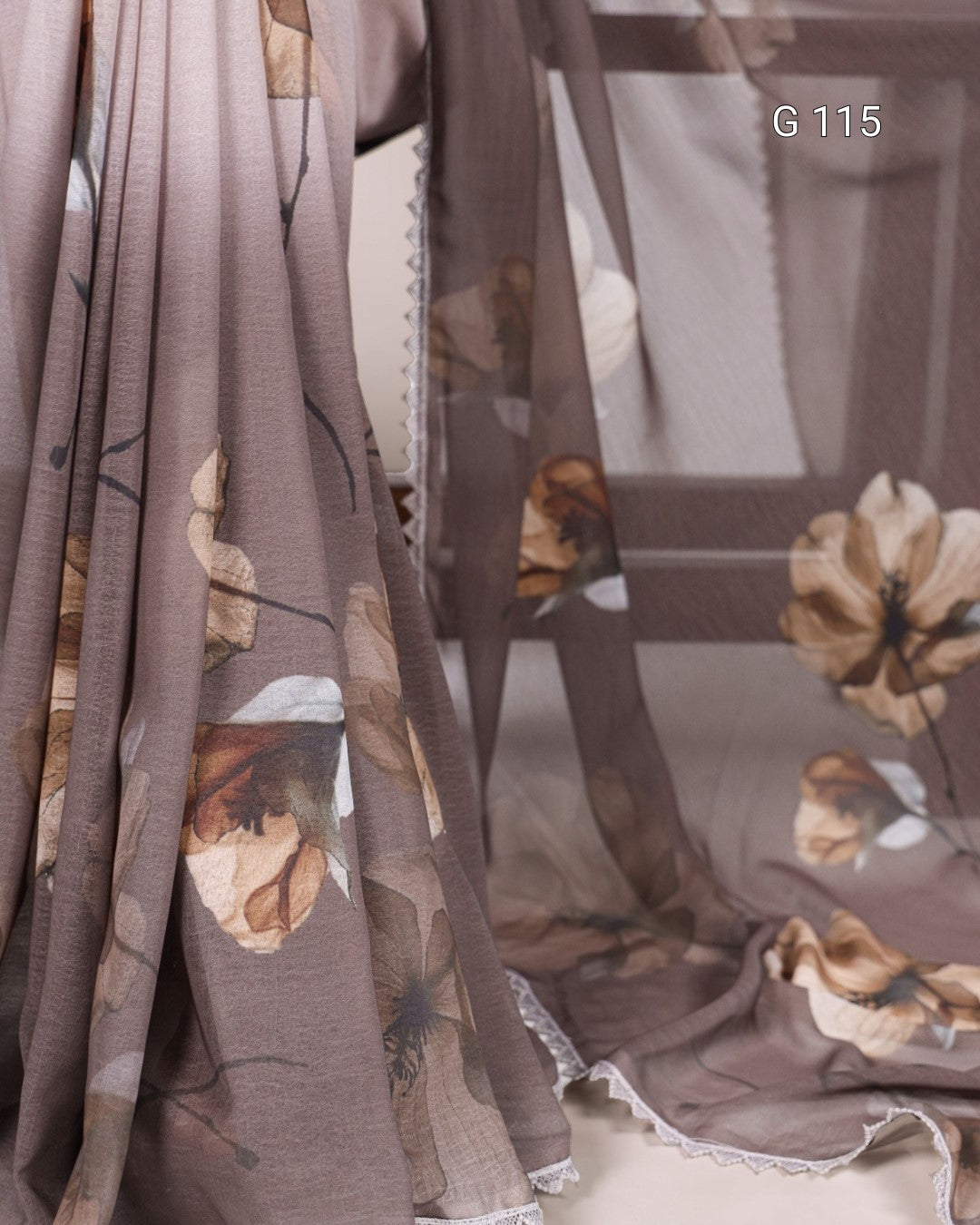 Floral Printed Weightless Marbal Saree with Lace Border – G 115 Coffee