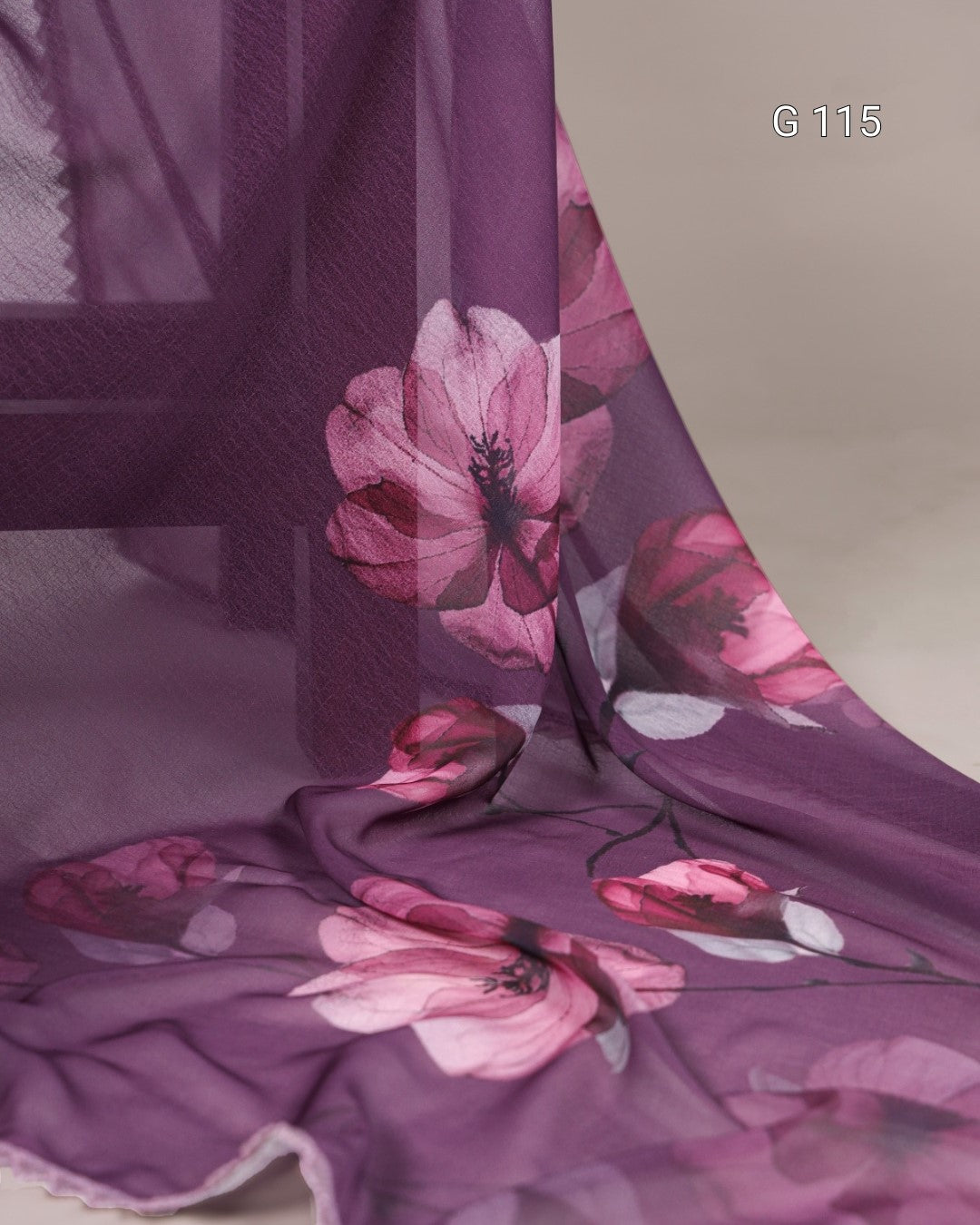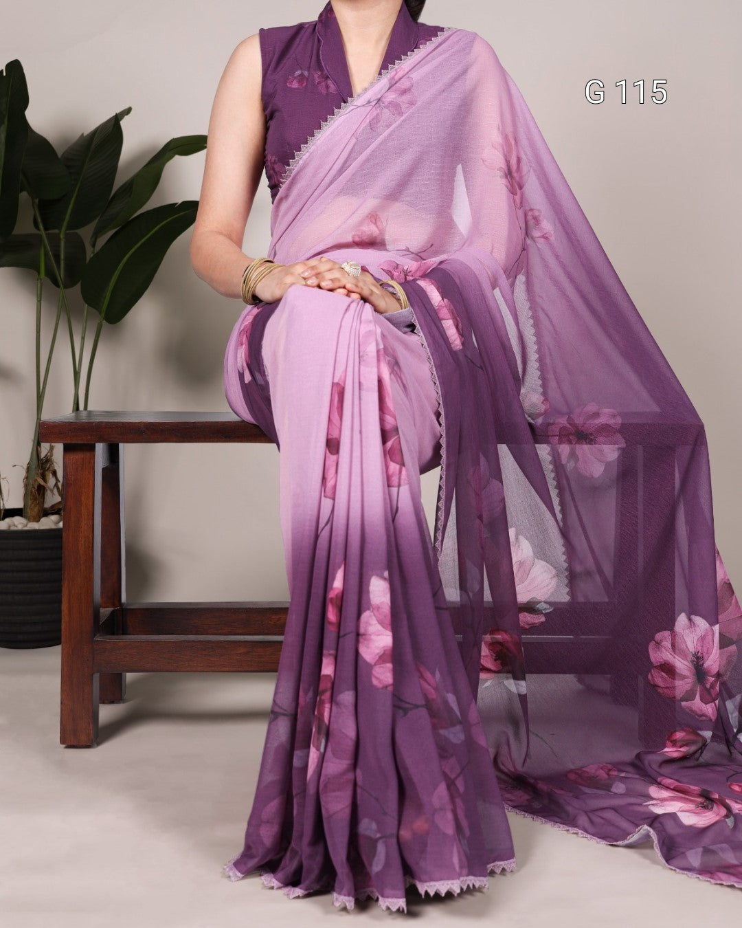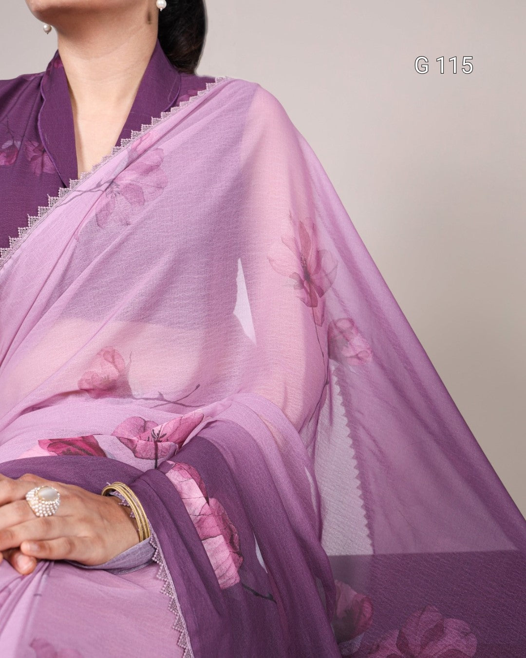 Floral Printed Weightless Marbal Saree with Lace Border – G 115 Purple