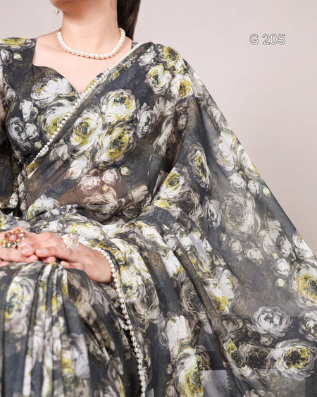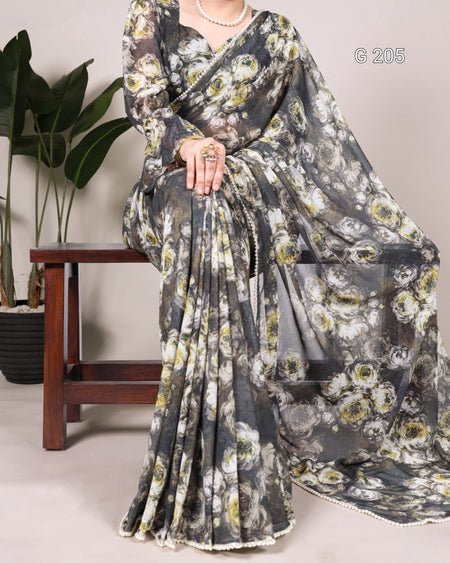 Floral Printed Weightless Marble Saree with Pearl Lace Border – G 205 Mehndi