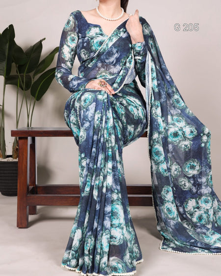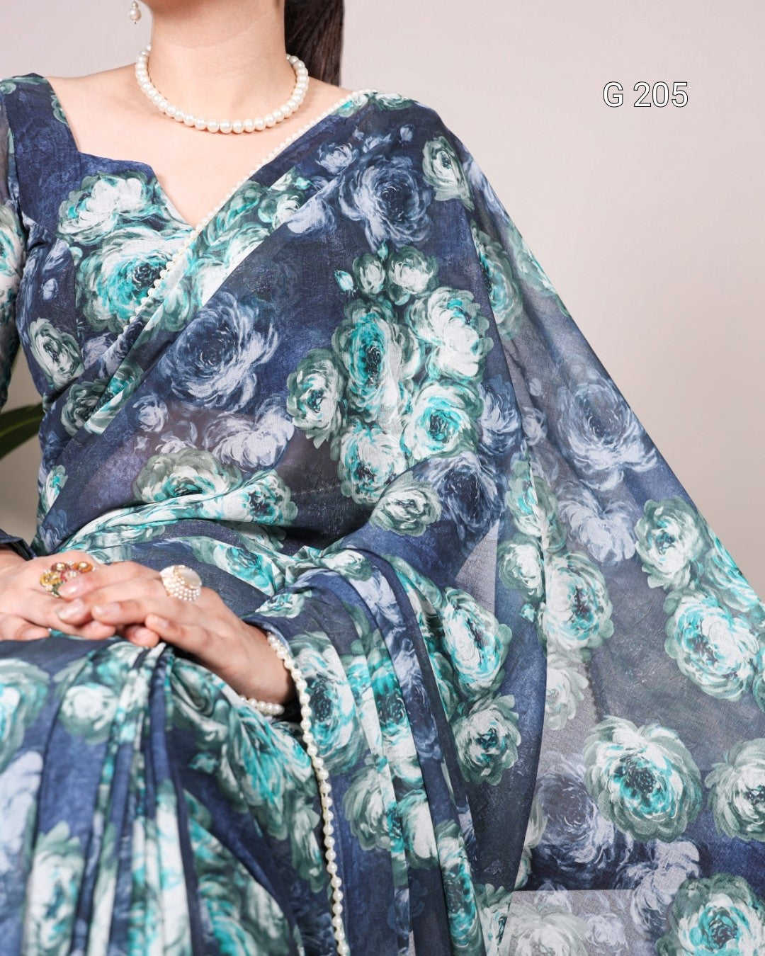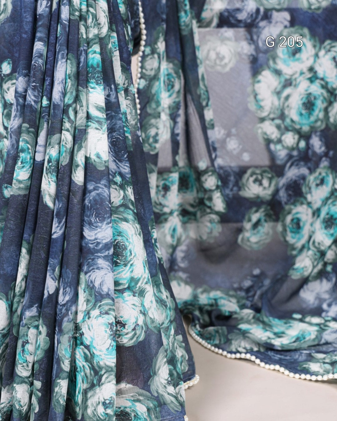 Floral Printed Weightless Marble Saree with Pearl Lace Border – G 205 Navi Blue
