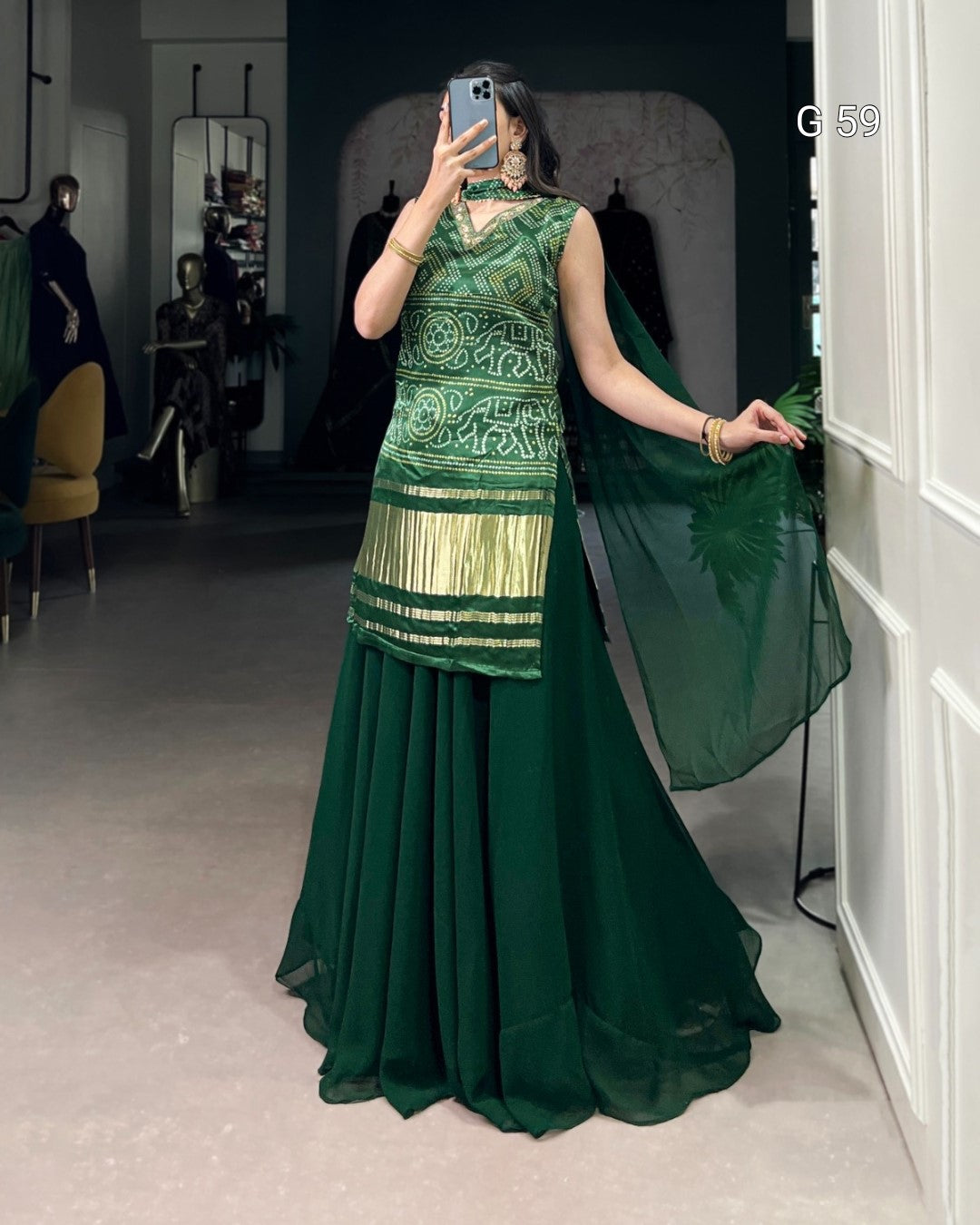 Gaji Silk Top with Printed Handwork & Georgette Plazo – G 59 Green