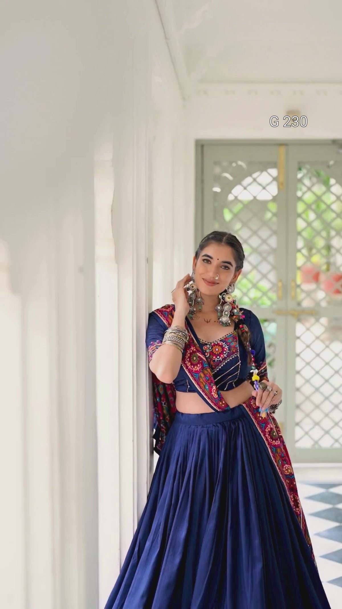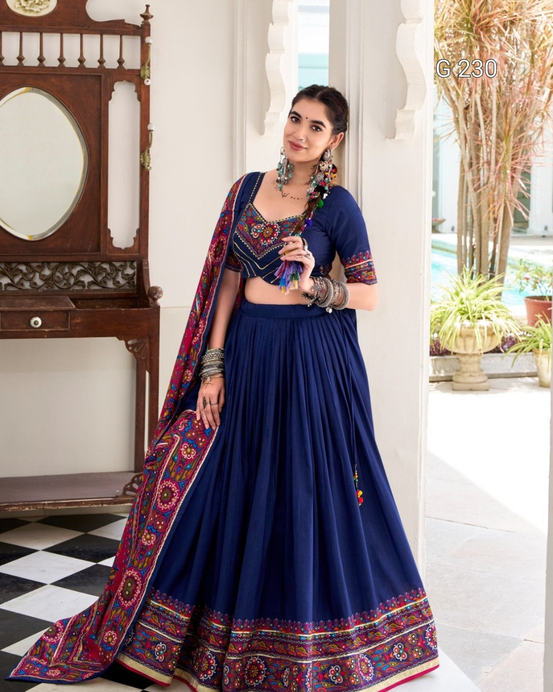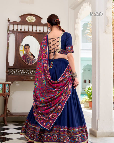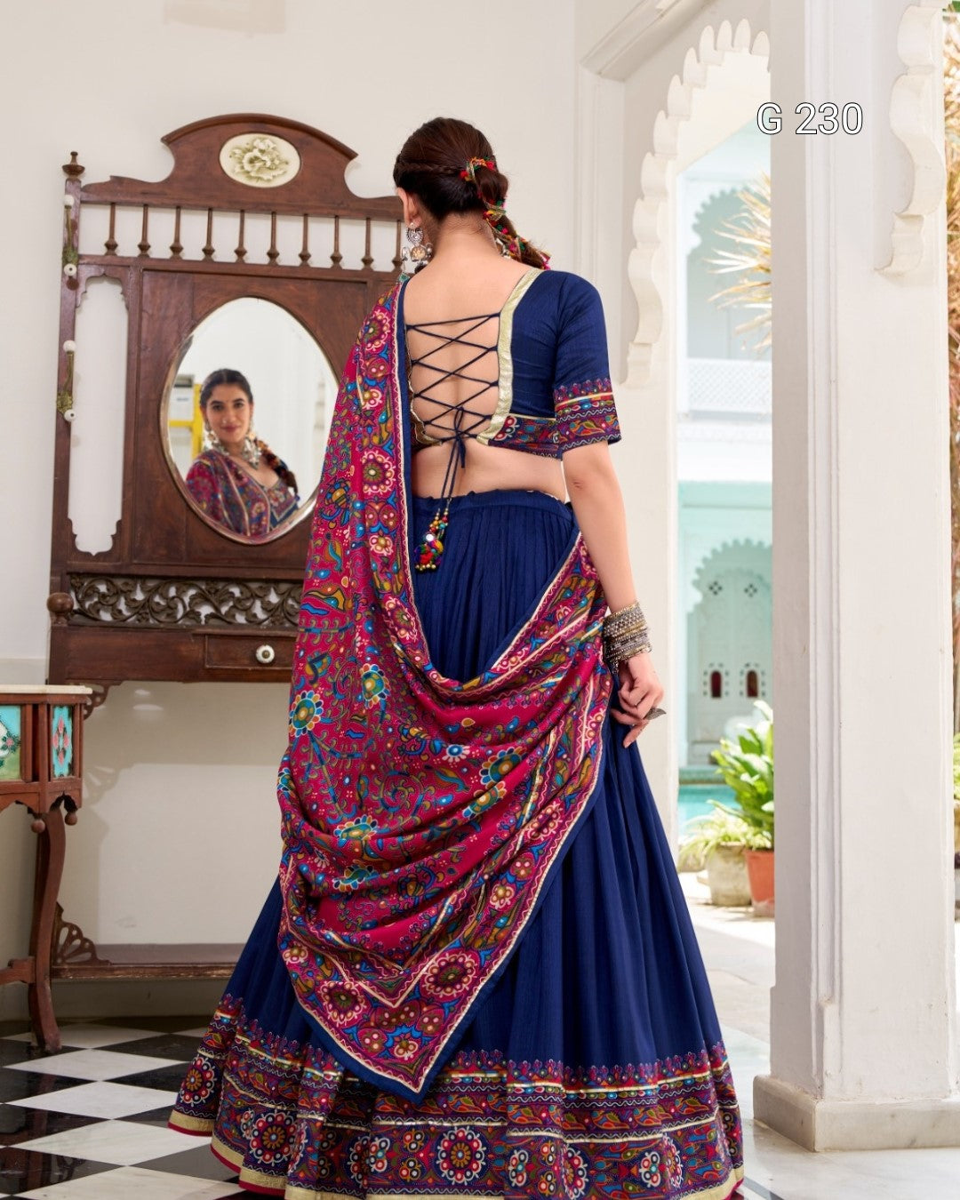 Gamthi Print Tasar Silk Lehenga with Embossed Design & Gotta Patti Lace – G 230 Navi Blue