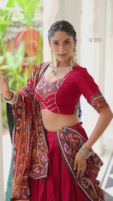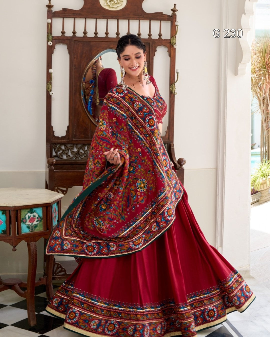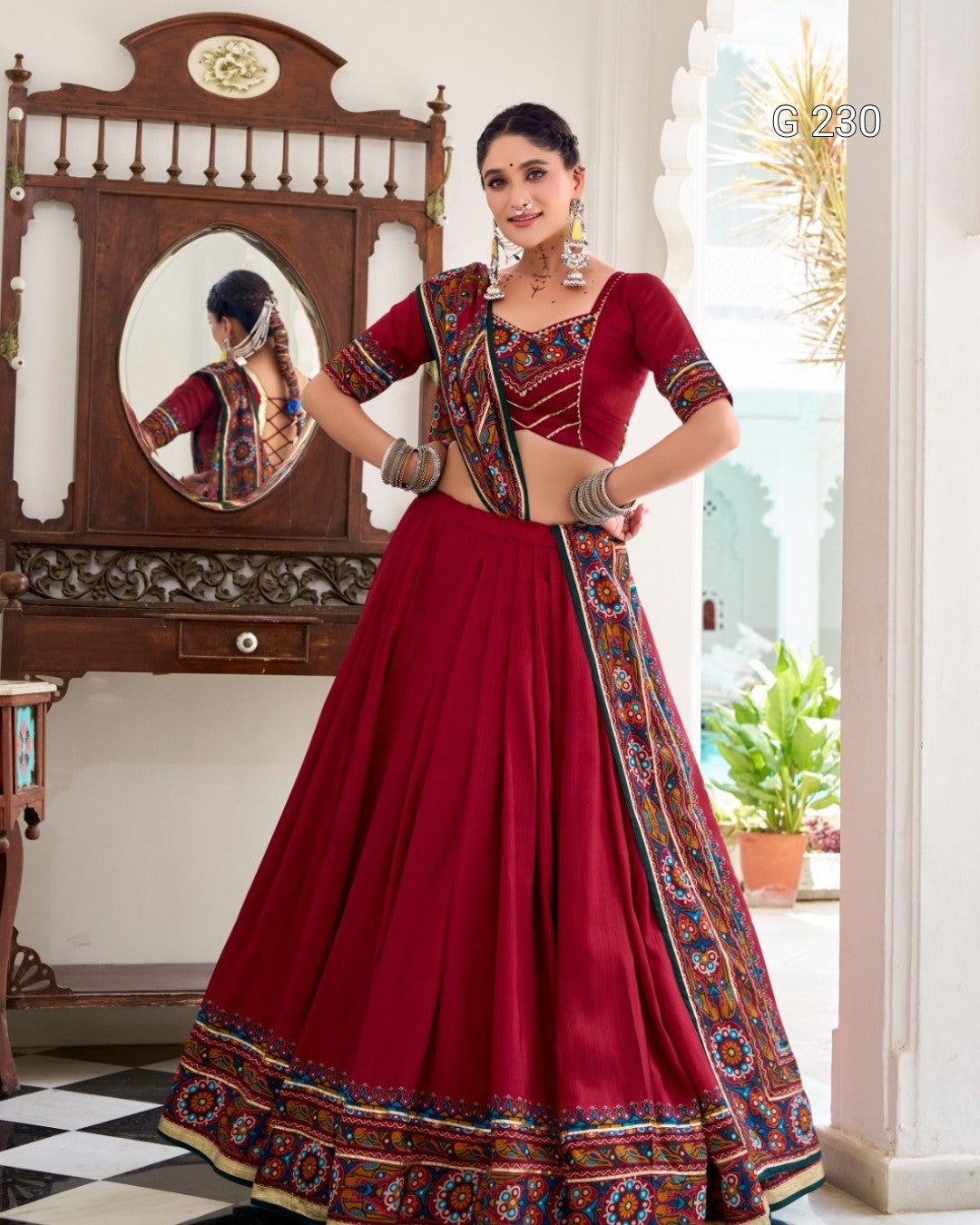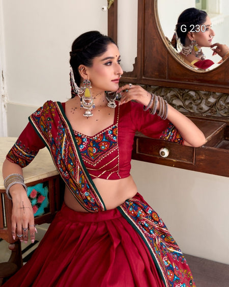 Gamthi Print Tasar Silk Lehenga with Embossed Design & Gotta Patti Lace – G 230 Red