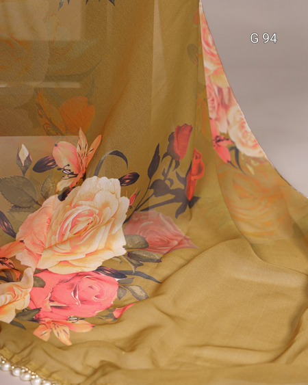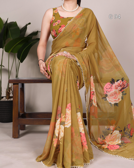 Georgette Saree with Printed Design & Pearl Lace Border – G 94 Brown