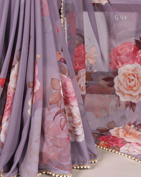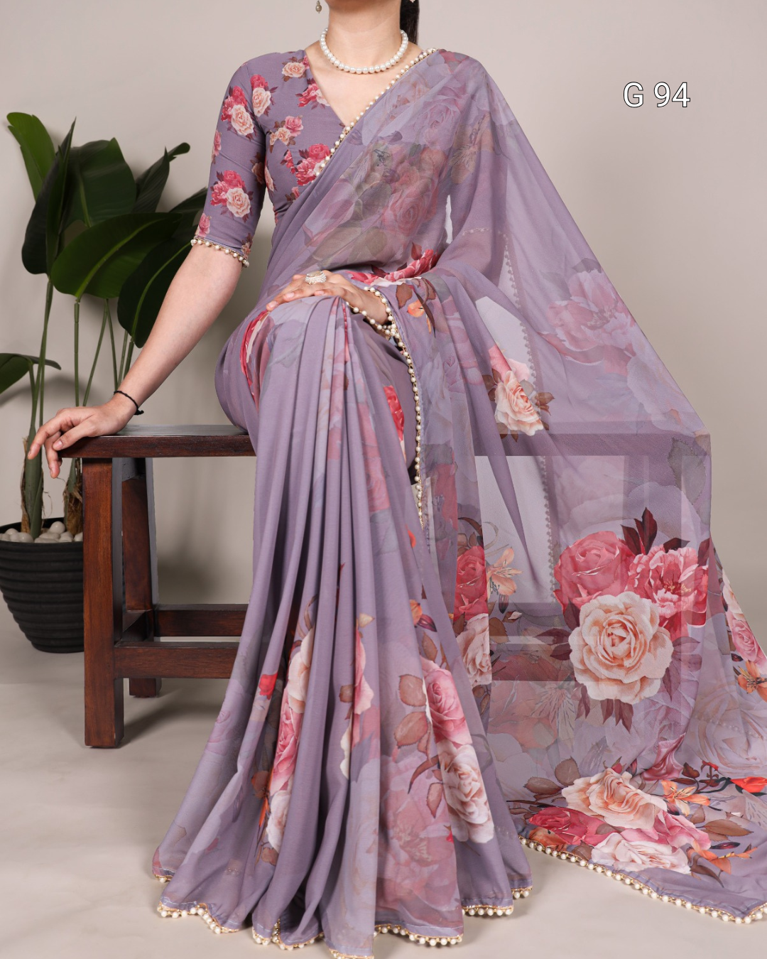 Georgette Saree with Printed Design & Pearl Lace Border – G 94 Gray
