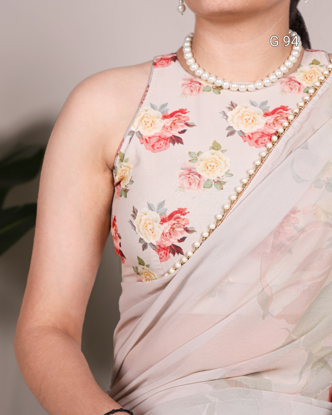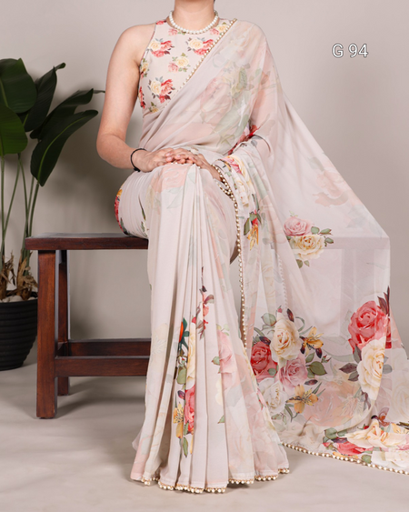 Georgette Saree with Printed Design & Pearl Lace Border – G 94 Off white