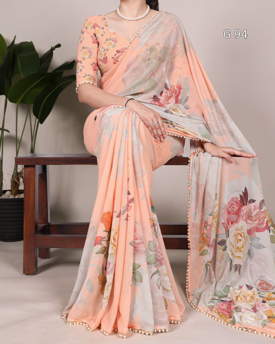 Georgette Saree with Printed Design & Pearl Lace Border – G 94 Peach