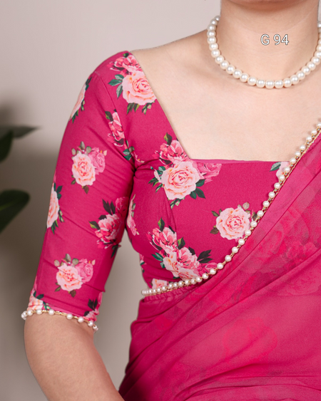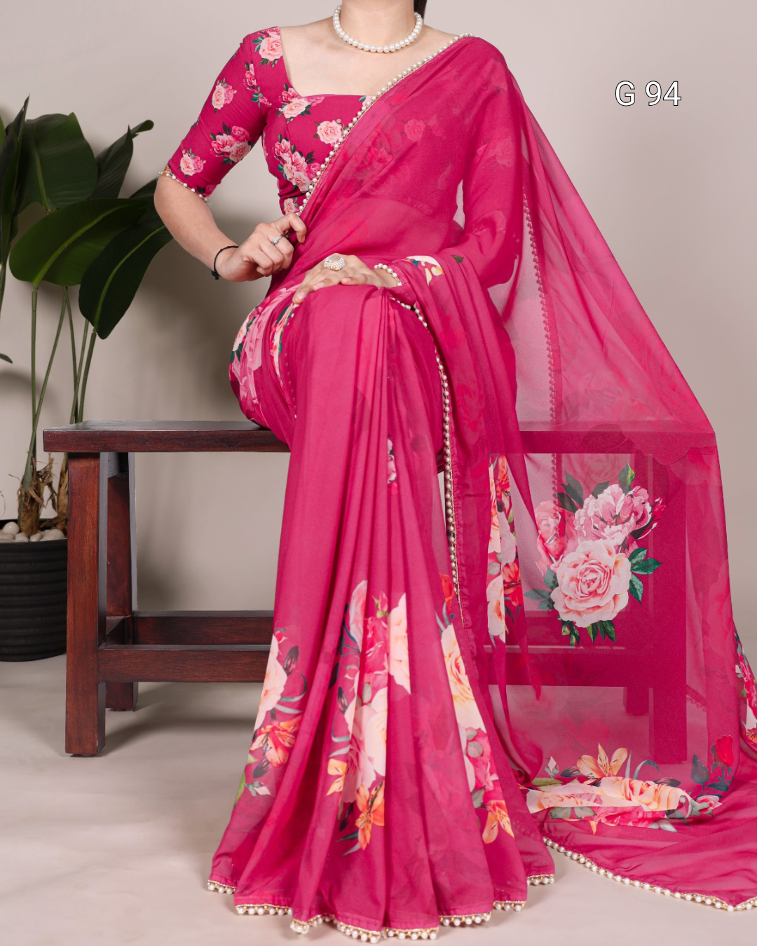 Georgette Saree with Printed Design & Pearl Lace Border – G 94 Pink