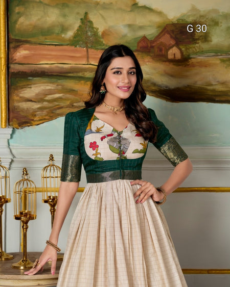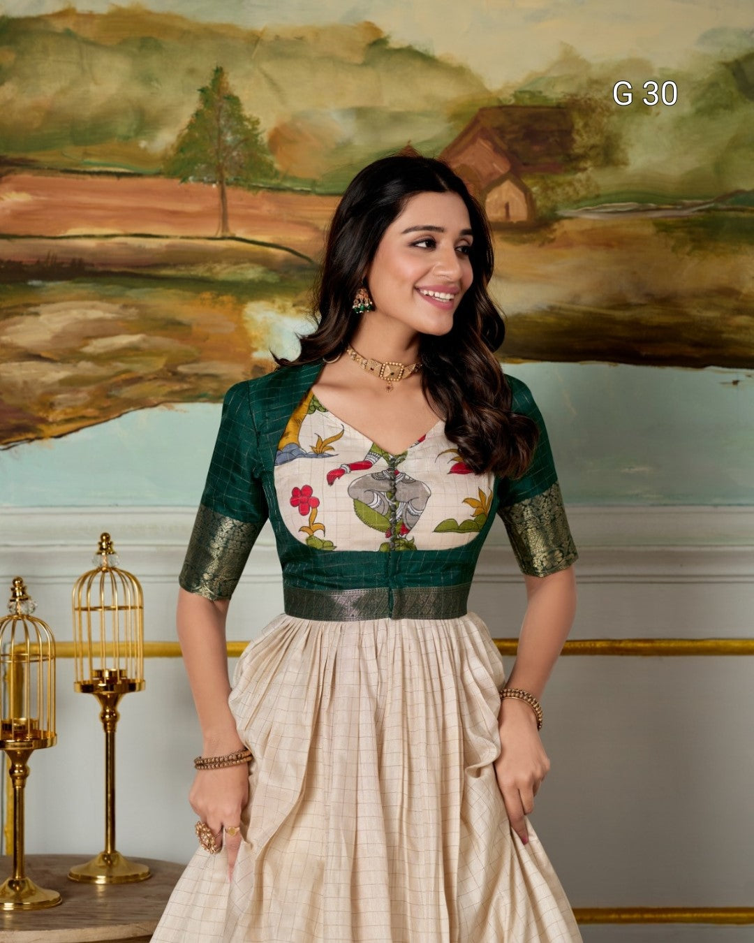 Gown Work : Kalamkari Print With Zari Weaving Broder