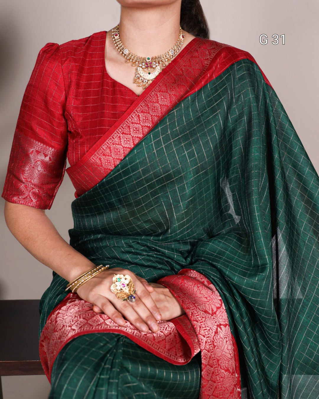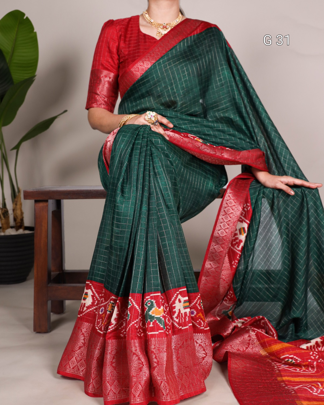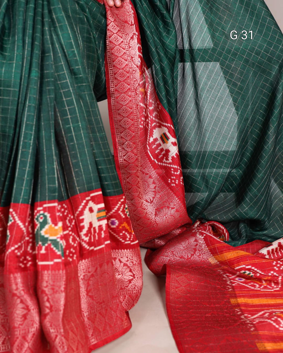 Green Tasar Chex Saree with Patola Print & Weaving Work Border – G 31 Green