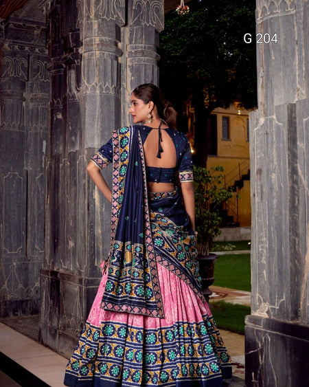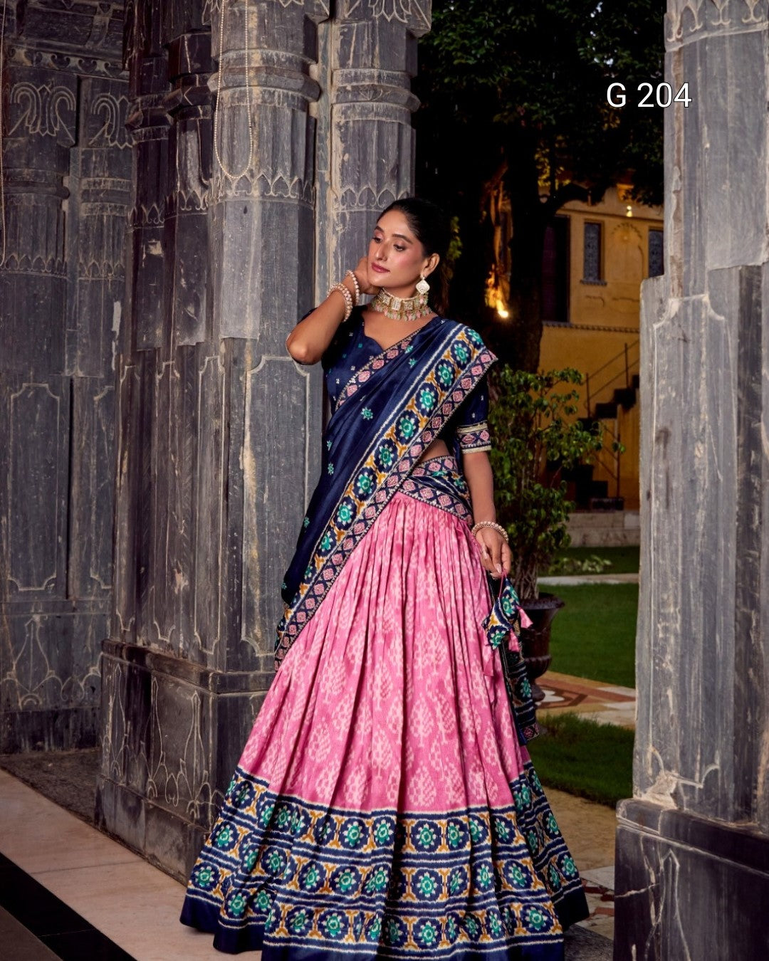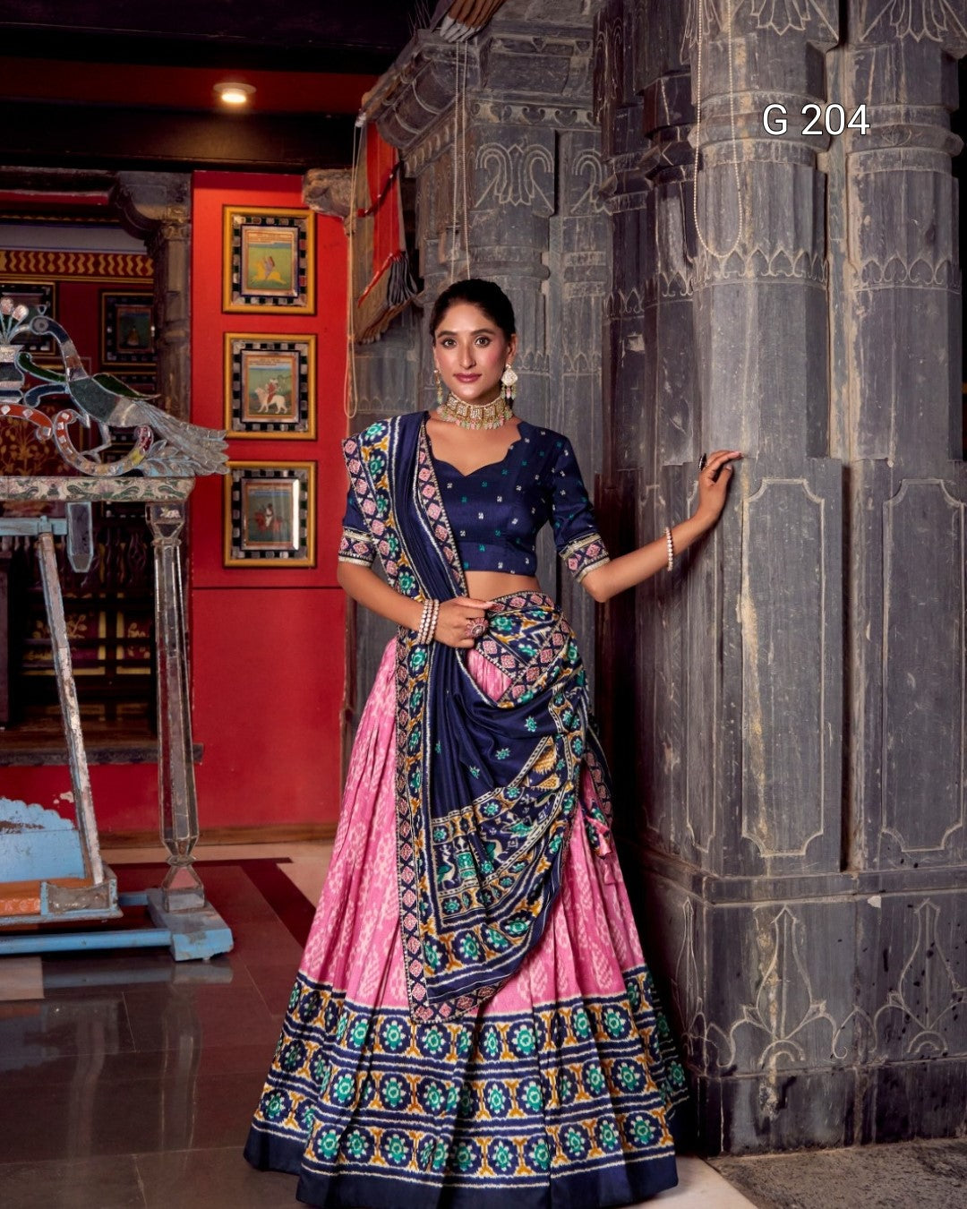 Ikkat Print Tasar Silk Lehenga with Sequins and Thread Embroidery Lace Blouse – G 204 Light Pink