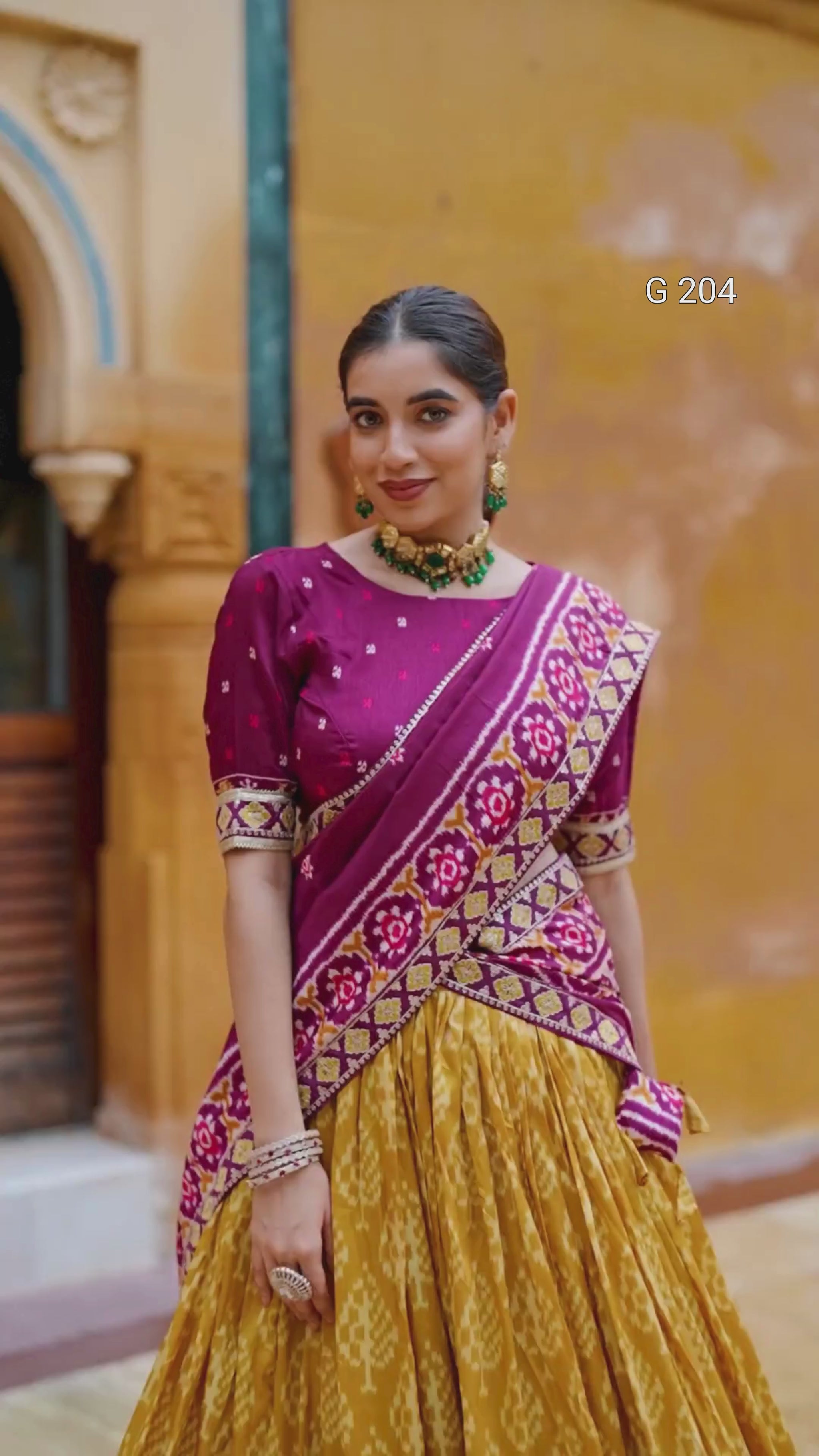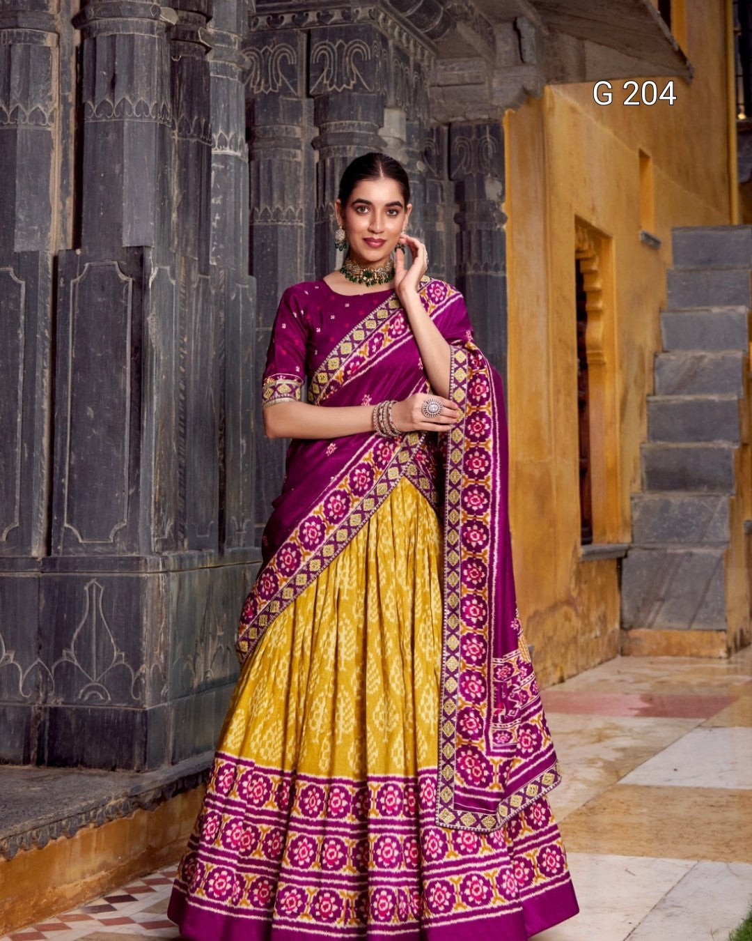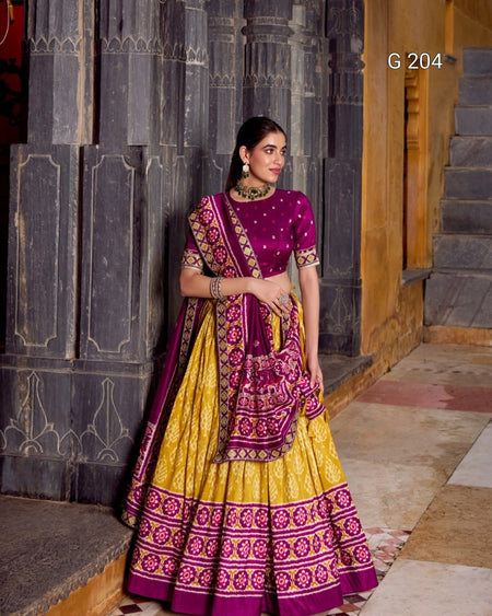 Ikkat Print Tasar Silk Lehenga with Sequins & Thread Embroidery Lace Blouse – G 204 Mustard