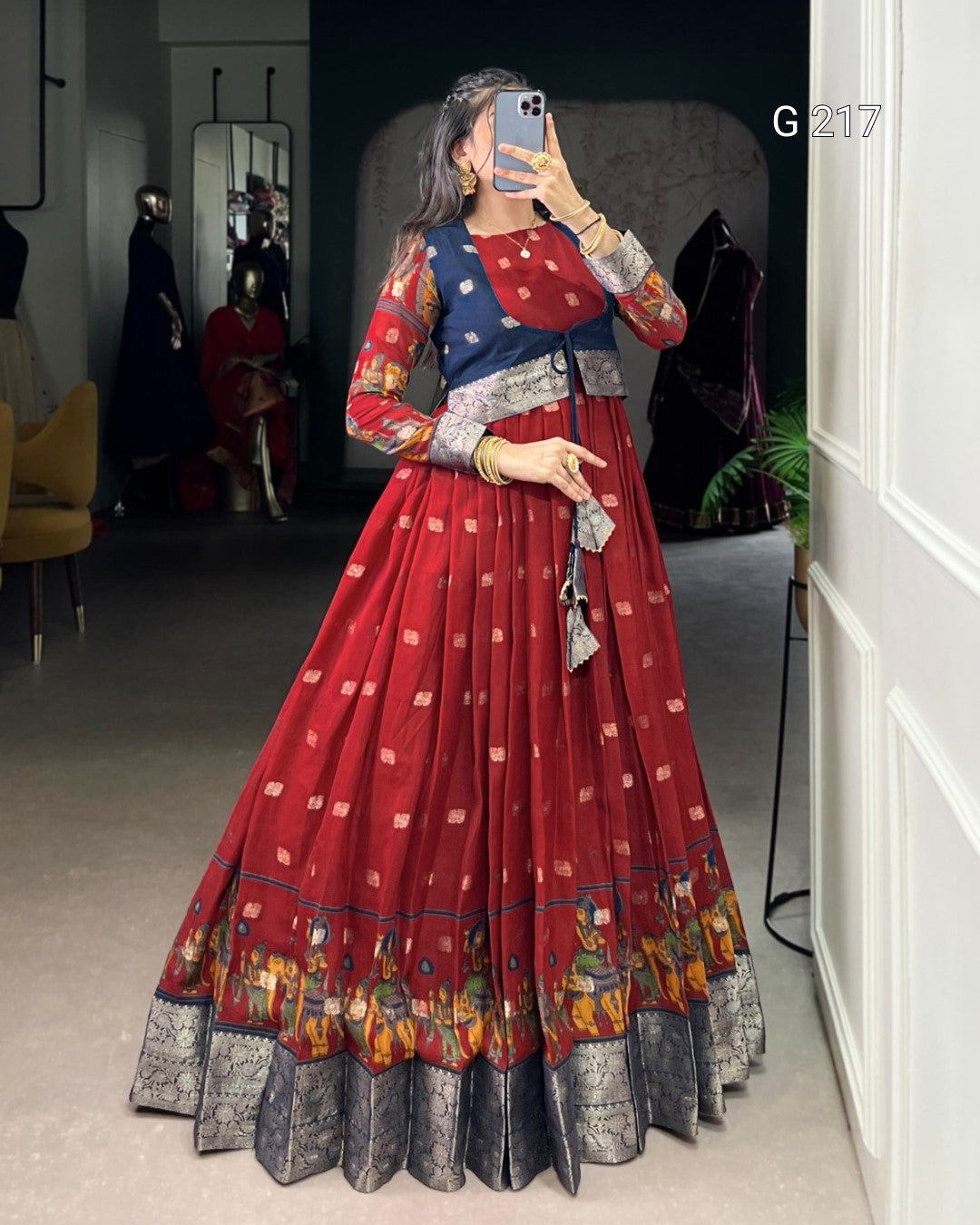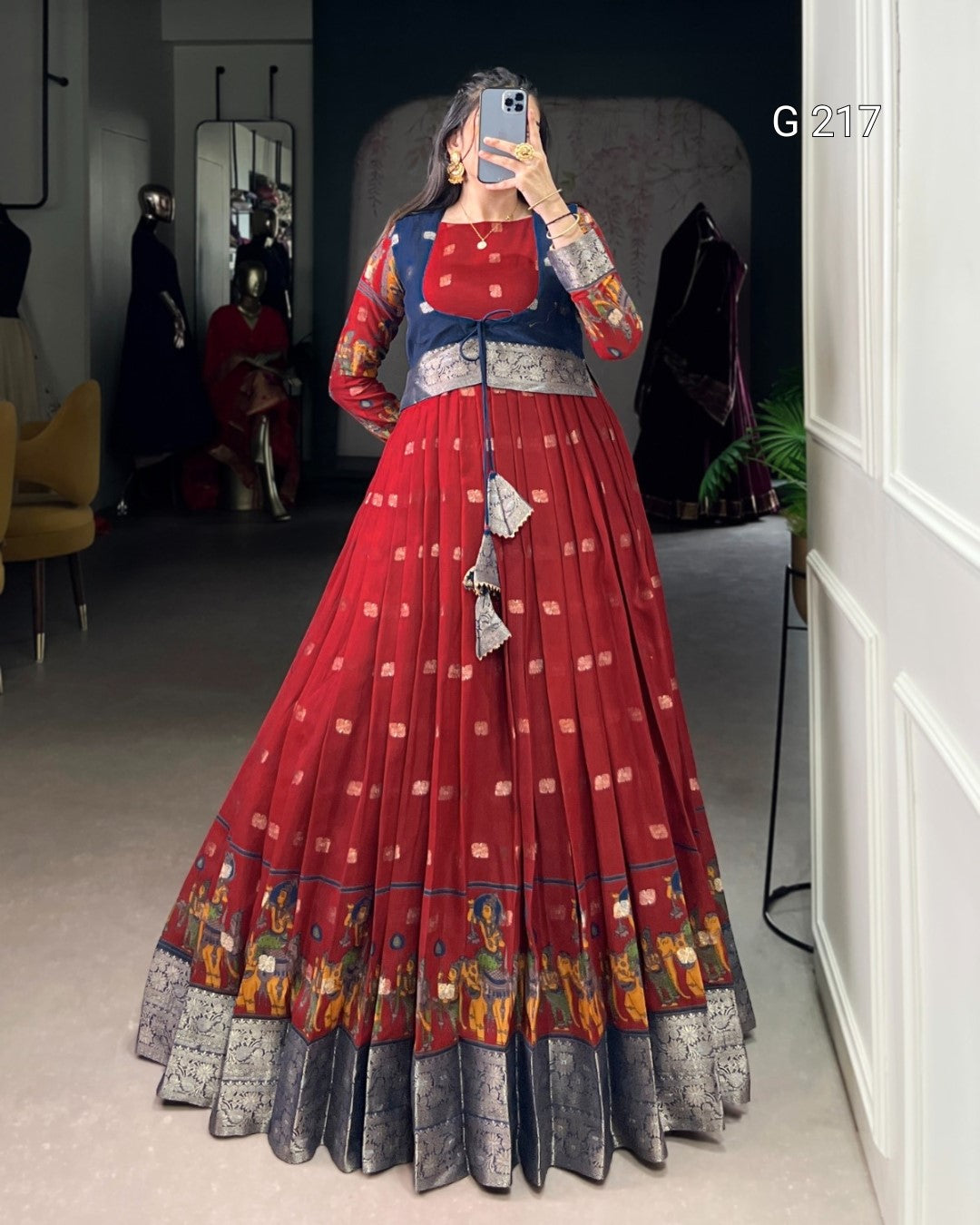 Kalamkari Print Poly Cotton Gown with Zari Weaving Work Border – G 217 Maroon