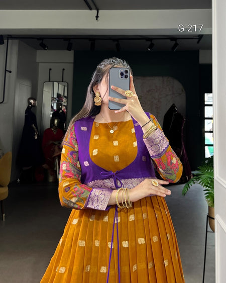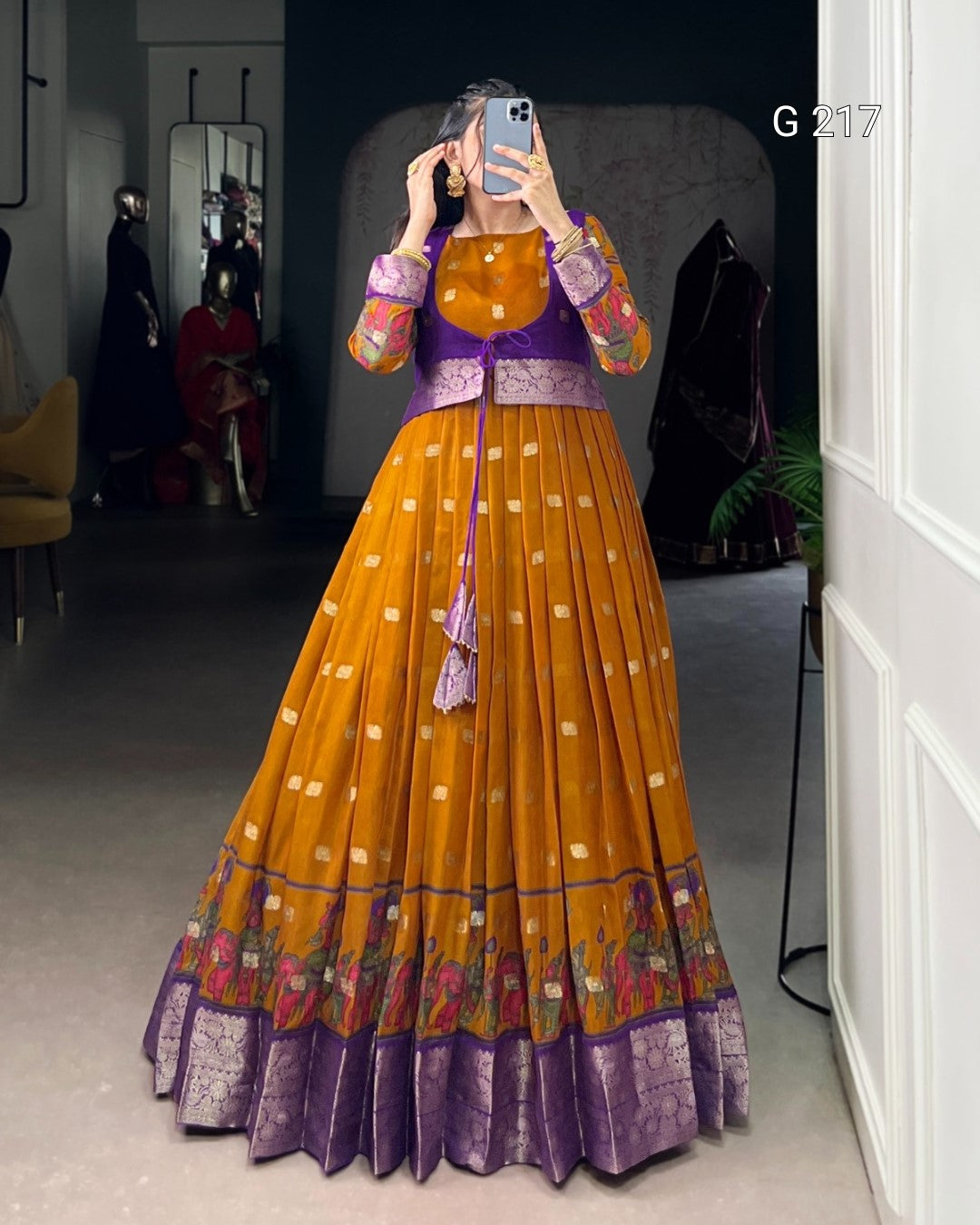 Kalamkari Print Poly Cotton Gown with Zari Weaving Work Border – G 217 Mustard