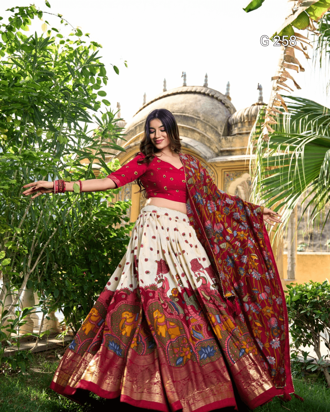 Kalamkari Print Tasar Silk Lehenga with Foil Work Border – G 261 Off White